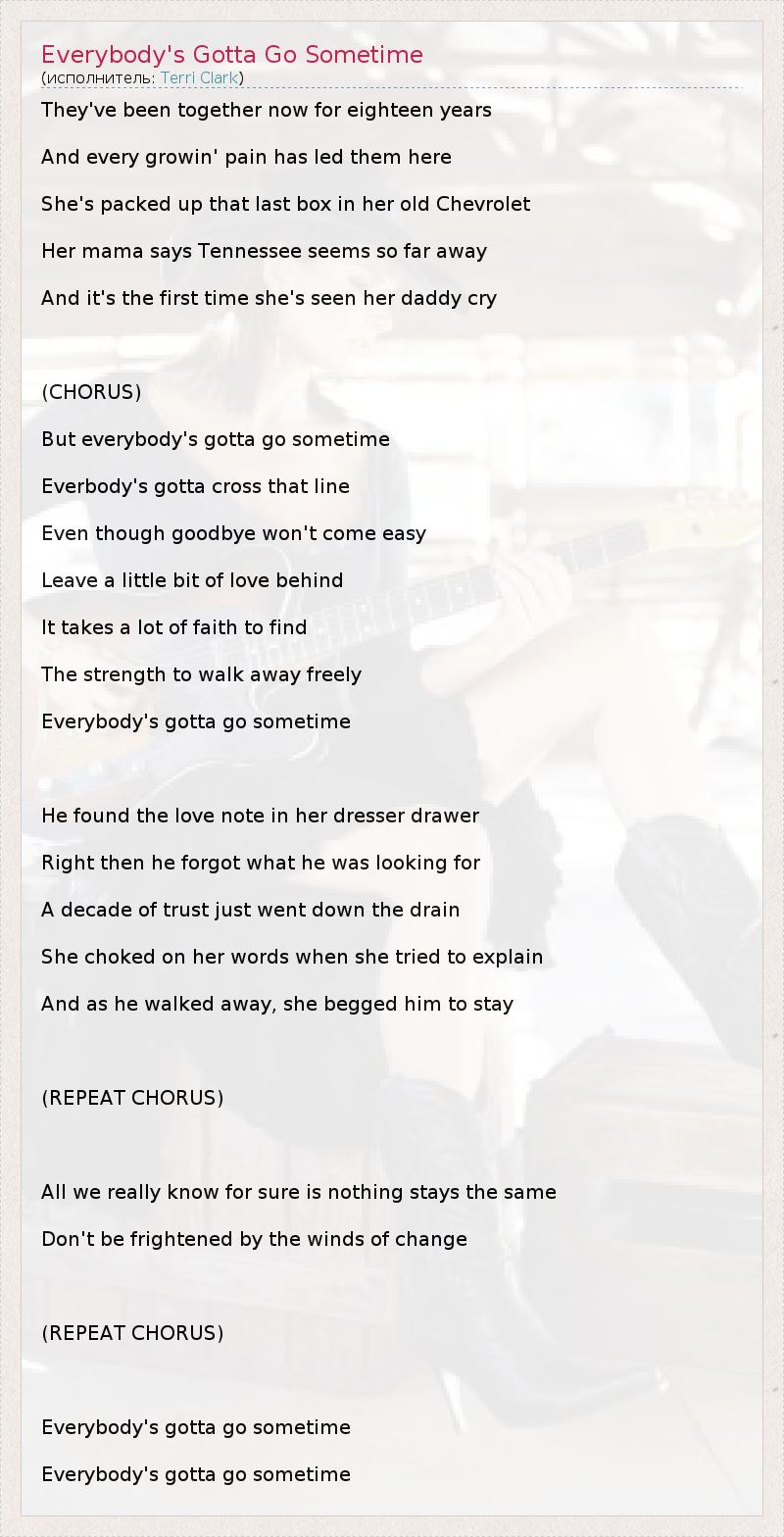 They've been together now for eighteen years And every growin' pain has led them here She's packed up that last box in her old Chevrolet Her mama says Tennessee seems so far away And it's the first time she's seen her daddy cry (CHORUS) But everybody's gotta go sometime Everbody's gotta cross that line Even though goodbye won't come easy Leave a little bit of love behind It takes a lot of faith to find The strength to walk away freely Everybody's gotta go sometime He found the love note in her dresser drawer Right then he forgot what he was looking for A decade of trust just went down the drain She choked on her words when she tried to explain And as he walked away, she begged him to stay (REPEAT CHORUS) All we really know for sure is nothing stays the same Don't be frightened by the winds of change (REPEAT CHORUS) Everybody's gotta go sometime Everybody's gotta go sometime