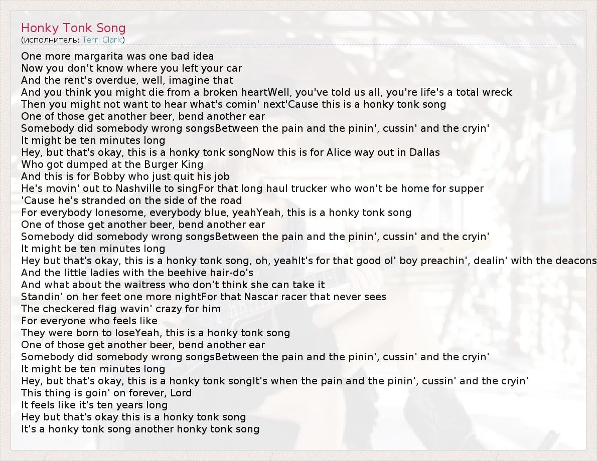 One more margarita was one bad idea Now you don't know where you left your car And the rent's overdue, well, imagine that And you think you might die from a broken heartWell, you've told us all, you're life's a total wreck Then you might not want to hear what's comin' next'Cause this is a honky tonk song One of those get another beer, bend another ear Somebody did somebody wrong songsBetween the pain and the pinin', cussin' and the cryin' It might be ten minutes long Hey, but that's okay, this is a honky tonk songNow this is for Alice way out in Dallas Who got dumped at the Burger King And this is for Bobby who just quit his job He's movin' out to Nashville to singFor that long haul trucker who won't be home for supper 'Cause he's stranded on the side of the road For everybody lonesome, everybody blue, yeahYeah, this is a honky tonk song One of those get another beer, bend another ear Somebody did somebody wrong songsBetween the pain and the pinin', cussin' and the cryin' It might be ten minutes long Hey but that's okay, this is a honky tonk song, oh, yeahIt's for that good ol' boy preachin', dealin' with the deacons And the little ladies with the beehive hair-do's And what about the waitress who don't think she can take it Standin' on her feet one more nightFor that Nascar racer that never sees The checkered flag wavin' crazy for him For everyone who feels like They were born to loseYeah, this is a honky tonk song One of those get another beer, bend another ear Somebody did somebody wrong songsBetween the pain and the pinin', cussin' and the cryin' It might be ten minutes long Hey, but that's okay, this is a honky tonk songIt's when the pain and the pinin', cussin' and the cryin' This thing is goin' on forever, Lord It feels like it's ten years long Hey but that's okay this is a honky tonk song It's a honky tonk song another honky tonk song