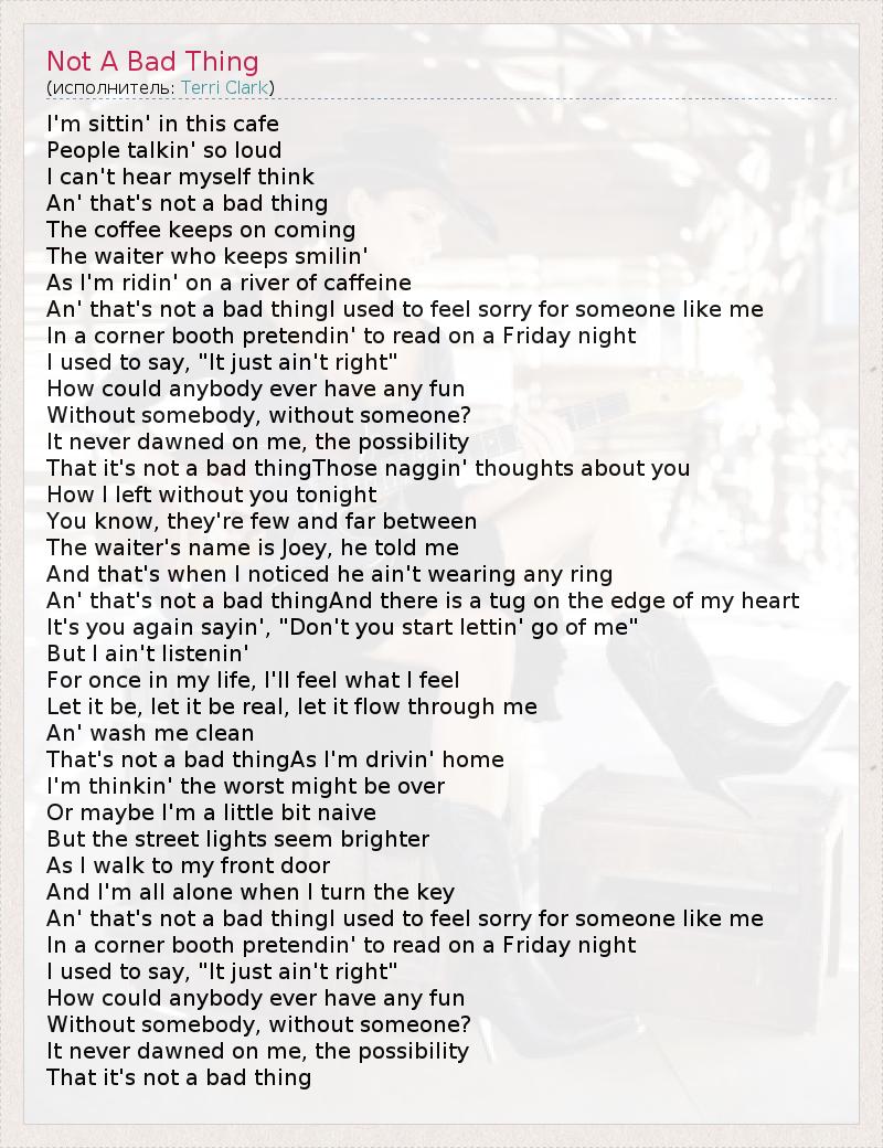I'm sittin' in this cafe People talkin' so loud I can't hear myself think An' that's not a bad thing The coffee keeps on coming The waiter who keeps smilin' As I'm ridin' on a river of caffeine An' that's not a bad thingI used to feel sorry for someone like me In a corner booth pretendin' to read on a Friday night I used to say, "It just ain't right" How could anybody ever have any fun Without somebody, without someone? It never dawned on me, the possibility That it's not a bad thingThose naggin' thoughts about you How I left without you tonight You know, they're few and far between The waiter's name is Joey, he told me And that's when I noticed he ain't wearing any ring An' that's not a bad thingAnd there is a tug on the edge of my heart It's you again sayin', "Don't you start lettin' go of me" But I ain't listenin' For once in my life, I'll feel what I feel Let it be, let it be real, let it flow through me An' wash me clean That's not a bad thingAs I'm drivin' home I'm thinkin' the worst might be over Or maybe I'm a little bit naive But the street lights seem brighter As I walk to my front door And I'm all alone when I turn the key An' that's not a bad thingI used to feel sorry for someone like me In a corner booth pretendin' to read on a Friday night I used to say, "It just ain't right" How could anybody ever have any fun Without somebody, without someone? It never dawned on me, the possibility That it's not a bad thing