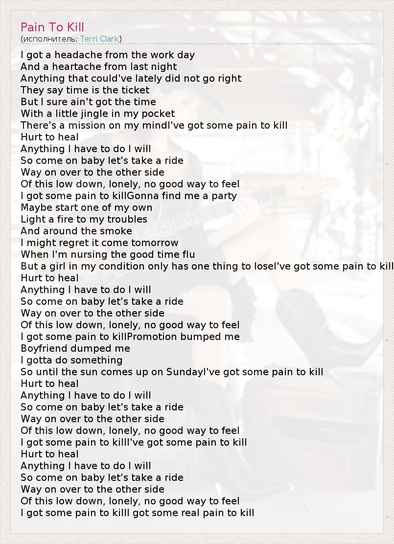 I got a headache from the work day And a heartache from last night Anything that could've lately did not go right They say time is the ticket But I sure ain't got the time With a little jingle in my pocket There's a mission on my mindI've got some pain to kill Hurt to heal Anything I have to do I will So come on baby let's take a ride Way on over to the other side Of this low down, lonely, no good way to feel I got some pain to killGonna find me a party Maybe start one of my own Light a fire to my troubles And around the smoke I might regret it come tomorrow When I'm nursing the good time flu But a girl in my condition only has one thing to loseI've got some pain to kill Hurt to heal Anything I have to do I will So come on baby let's take a ride Way on over to the other side Of this low down, lonely, no good way to feel I got some pain to killPromotion bumped me Boyfriend dumped me I gotta do something So until the sun comes up on SundayI've got some pain to kill Hurt to heal Anything I have to do I will So come on baby let's take a ride Way on over to the other side Of this low down, lonely, no good way to feel I got some pain to killI've got some pain to kill Hurt to heal Anything I have to do I will So come on baby let's take a ride Way on over to the other side Of this low down, lonely, no good way to feel I got some pain to killI got some real pain to kill