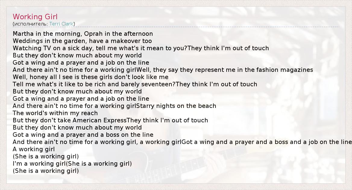 Martha in the morning, Oprah in the afternoon Weddings in the garden, have a makeover too Watching TV on a sick day, tell me what's it mean to you?They think I'm out of touch But they don't know much about my world Got a wing and a prayer and a job on the line And there ain't no time for a working girlWell, they say they represent me in the fashion magazines Well, honey all I see is these girls don't look like me Tell me what's it like to be rich and barely seventeen?They think I'm out of touch But they don't know much about my world Got a wing and a prayer and a job on the line And there ain't no time for a working girlStarry nights on the beach The world's within my reach But they don't take American ExpressThey think I'm out of touch But they don't know much about my world Got a wing and a prayer and a boss on the line And there ain't no time for a working girl, a working girlGot a wing and a prayer and a boss and a job on the line A working girl (She is a working girl) I'm a working girl(She is a working girl) (She is a working girl)