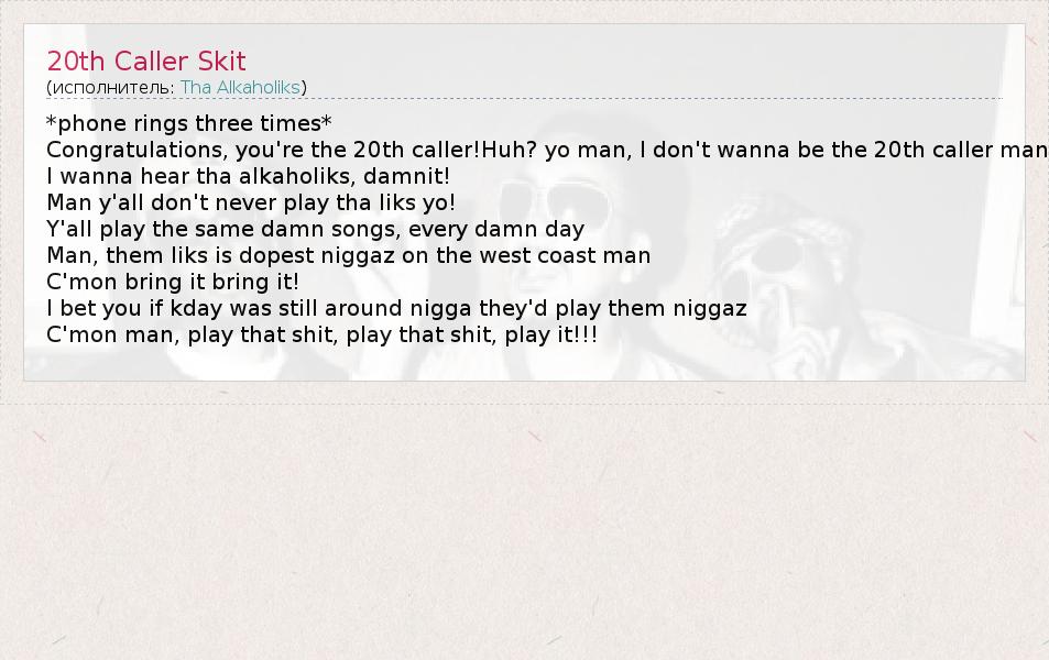 *phone rings three times* Congratulations, you're the 20th caller!Huh? yo man, I don't wanna be the 20th caller man I wanna hear tha alkaholiks, damnit! Man y'all don't never play tha liks yo! Y'all play the same damn songs, every damn day Man, them liks is dopest niggaz on the west coast man C'mon bring it bring it! I bet you if kday was still around nigga they'd play them niggaz C'mon man, play that shit, play that shit, play it!!!