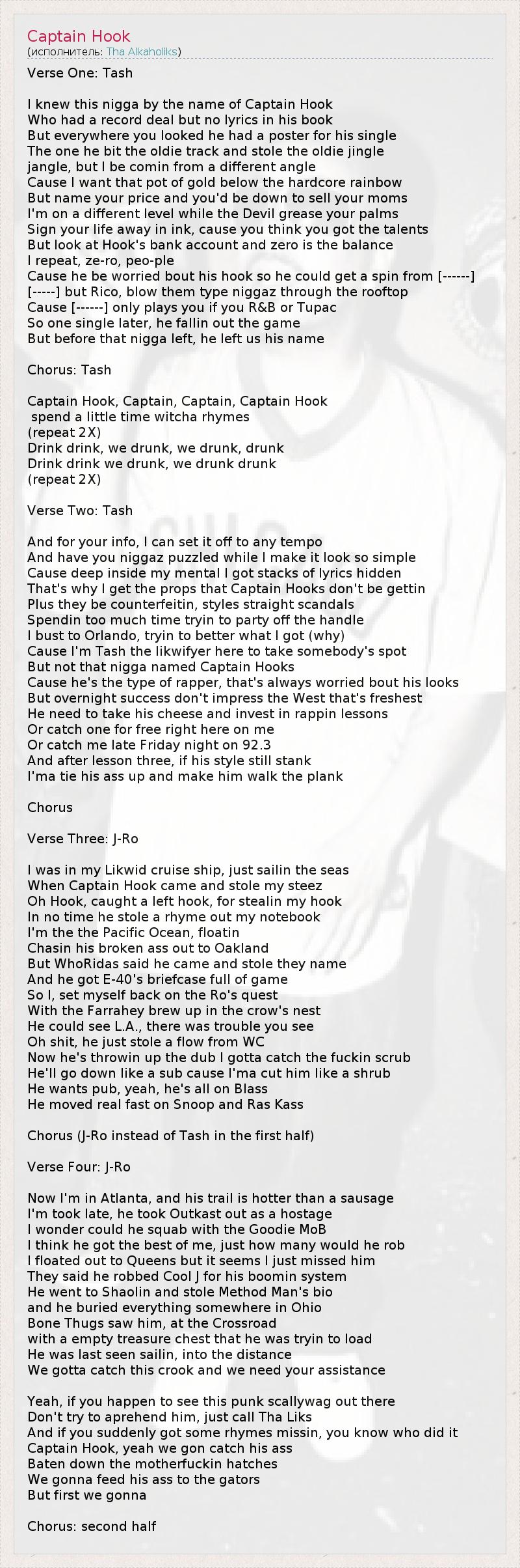 Verse One: Tash I knew this nigga by the name of Captain Hook Who had a record deal but no lyrics in his book But everywhere you looked he had a poster for his single The one he bit the oldie track and stole the oldie jingle jangle, but I be comin from a different angle Cause I want that pot of gold below the hardcore rainbow But name your price and you'd be down to sell your moms I'm on a different level while the Devil grease your palms Sign your life away in ink, cause you think you got the talents But look at Hook's bank account and zero is the balance I repeat, ze-ro, peo-ple Cause he be worried bout his hook so he could get a spin from [------] [-----] but Rico, blow them type niggaz through the rooftop Cause [------] only plays you if you R&B or Tupac So one single later, he fallin out the game But before that nigga left, he left us his name Chorus: Tash Captain Hook, Captain, Captain, Captain Hook spend a little time witcha rhymes (repeat 2X) Drink drink, we drunk, we drunk, drunk Drink drink we drunk, we drunk drunk (repeat 2X) Verse Two: Tash And for your info, I can set it off to any tempo And have you niggaz puzzled while I make it look so simple Cause deep inside my mental I got stacks of lyrics hidden That's why I get the props that Captain Hooks don't be gettin Plus they be counterfeitin, styles straight scandals Spendin too much time tryin to party off the handle I bust to Orlando, tryin to better what I got (why) Cause I'm Tash the likwifyer here to take somebody's spot But not that nigga named Captain Hooks Cause he's the type of rapper, that's always worried bout his looks But overnight success don't impress the West that's freshest He need to take his cheese and invest in rappin lessons Or catch one for free right here on me Or catch me late Friday night on 92.3 And after lesson three, if his style still stank I'ma tie his ass up and make him walk the plank Chorus Verse Three: J-Ro I was in my Likwid cruise ship, just sailin the seas When Captain Hook came and stole my steez Oh Hook, caught a left hook, for stealin my hook In no time he stole a rhyme out my notebook I'm the the Pacific Ocean, floatin Chasin his broken ass out to Oakland But WhoRidas said he came and stole they name And he got E-40's briefcase full of game So I, set myself back on the Ro's quest With the Farrahey brew up in the crow's nest He could see L.A., there was trouble you see Oh shit, he just stole a flow from WC Now he's throwin up the dub I gotta catch the fuckin scrub He'll go down like a sub cause I'ma cut him like a shrub He wants pub, yeah, he's all on Blass He moved real fast on Snoop and Ras Kass Chorus (J-Ro instead of Tash in the first half) Verse Four: J-Ro Now I'm in Atlanta, and his trail is hotter than a sausage I'm took late, he took Outkast out as a hostage I wonder could he squab with the Goodie MoB I think he got the best of me, just how many would he rob I floated out to Queens but it seems I just missed him They said he robbed Cool J for his boomin system He went to Shaolin and stole Method Man's bio and he buried everything somewhere in Ohio Bone Thugs saw him, at the Crossroad with a empty treasure chest that he was tryin to load He was last seen sailin, into the distance We gotta catch this crook and we need your assistance Yeah, if you happen to see this punk scallywag out there Don't try to aprehend him, just call Tha Liks And if you suddenly got some rhymes missin, you know who did it Captain Hook, yeah we gon catch his ass Baten down the motherfuckin hatches We gonna feed his ass to the gators But first we gonna Chorus: second half