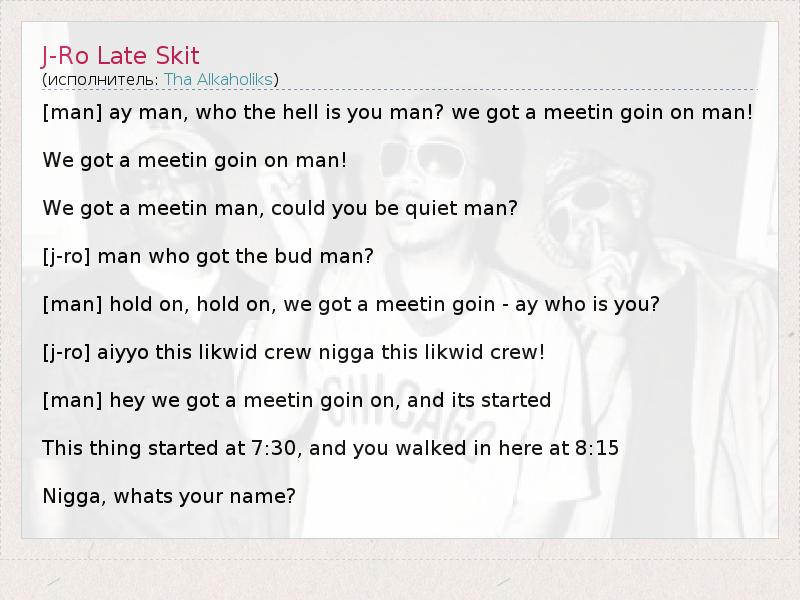 [man] ay man, who the hell is you man? we got a meetin goin on man! We got a meetin goin on man! We got a meetin man, could you be quiet man? [j-ro] man who got the bud man? [man] hold on, hold on, we got a meetin goin - ay who is you? [j-ro] aiyyo this likwid crew nigga this likwid crew! [man] hey we got a meetin goin on, and its started This thing started at 7:30, and you walked in here at 8:15 Nigga, whats your name?