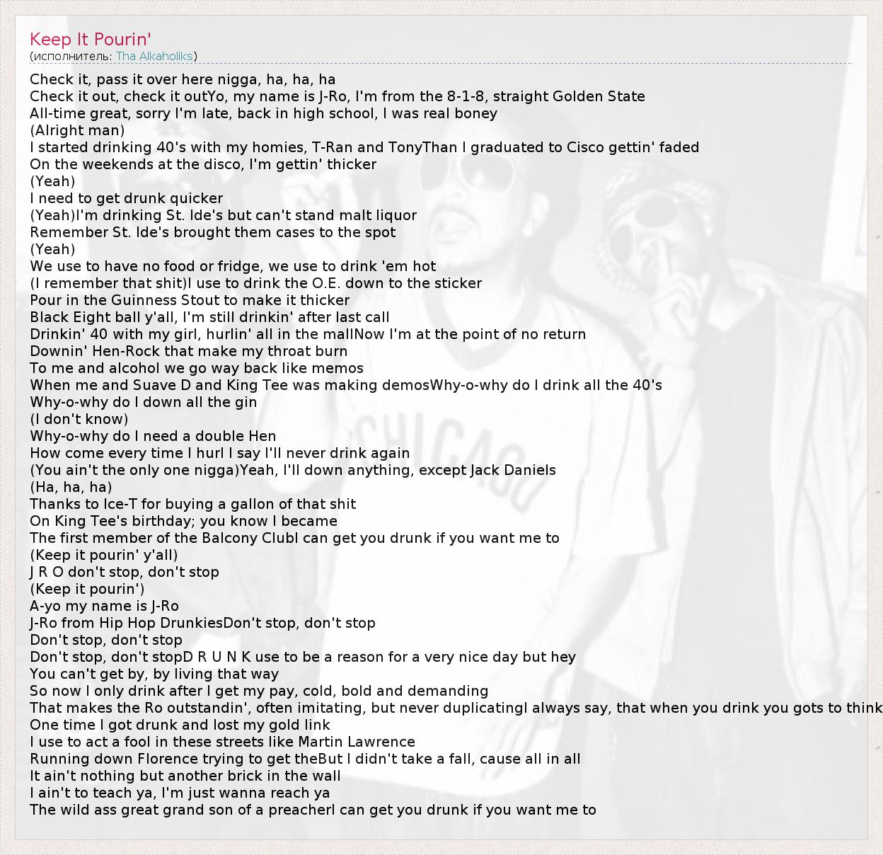 Check it, pass it over here nigga, ha, ha, ha Check it out, check it outYo, my name is J-Ro, I'm from the 8-1-8, straight Golden State All-time great, sorry I'm late, back in high school, I was real boney (Alright man) I started drinking 40's with my homies, T-Ran and TonyThan I graduated to Cisco gettin' faded On the weekends at the disco, I'm gettin' thicker (Yeah) I need to get drunk quicker (Yeah)I'm drinking St. Ide's but can't stand malt liquor Remember St. Ide's brought them cases to the spot (Yeah) We use to have no food or fridge, we use to drink 'em hot (I remember that shit)I use to drink the O.E. down to the sticker Pour in the Guinness Stout to make it thicker Black Eight ball y'all, I'm still drinkin' after last call Drinkin' 40 with my girl, hurlin' all in the mallNow I'm at the point of no return Downin' Hen-Rock that make my throat burn To me and alcohol we go way back like memos When me and Suave D and King Tee was making demosWhy-o-why do I drink all the 40's Why-o-why do I down all the gin (I don't know) Why-o-why do I need a double Hen How come every time I hurl I say I'll never drink again (You ain't the only one nigga)Yeah, I'll down anything, except Jack Daniels (Ha, ha, ha) Thanks to Ice-T for buying a gallon of that shit On King Tee's birthday; you know I became The first member of the Balcony ClubI can get you drunk if you want me to (Keep it pourin' y'all) J R O don't stop, don't stop (Keep it pourin') A-yo my name is J-Ro J-Ro from Hip Hop DrunkiesDon't stop, don't stop Don't stop, don't stop Don't stop, don't stopD R U N K use to be a reason for a very nice day but hey You can't get by, by living that way So now I only drink after I get my pay, cold, bold and demanding That makes the Ro outstandin', often imitating, but never duplicatingI always say, that when you drink you gots to think One time I got drunk and lost my gold link I use to act a fool in these streets like Martin Lawrence Running down Florence trying to get theBut I didn't take a fall, cause all in all It ain't nothing but another brick in the wall I ain't to teach ya, I'm just wanna reach ya The wild ass great grand son of a preacherI can get you drunk if you want me to
