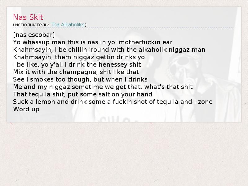[nas escobar] Yo whassup man this is nas in yo' motherfuckin ear Knahmsayin, I be chillin 'round with the alkaholik niggaz man Knahmsayin, them niggaz gettin drinks yo I be like, yo y'all I drink the henessey shit Mix it with the champagne, shit like that See I smokes too though, but when I drinks Me and my niggaz sometime we get that, what's that shit That tequila shit, put some salt on your hand Suck a lemon and drink some a fuckin shot of tequila and I zone Word up