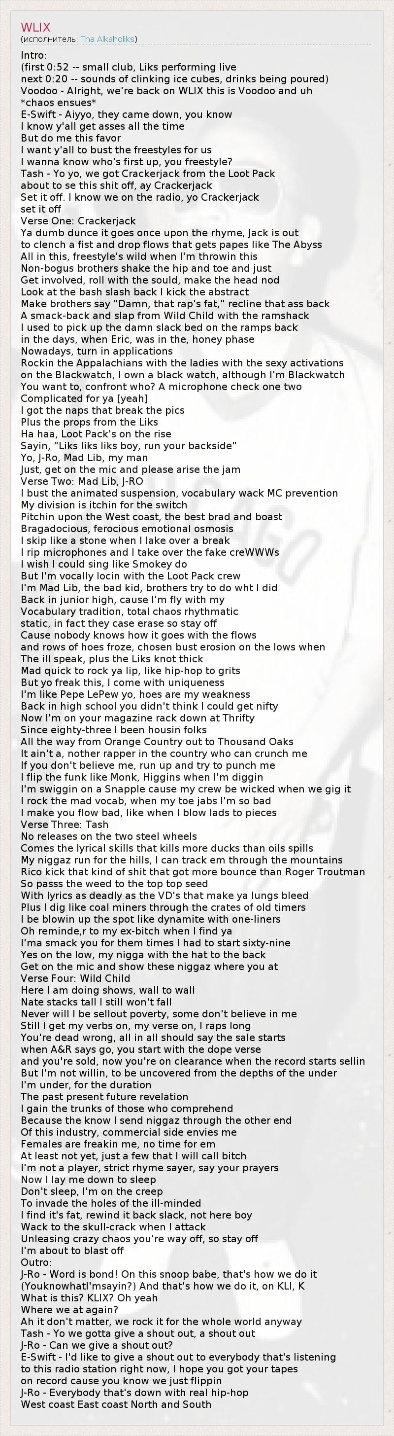 Это интересно:Группа Tha Alkaholiks, также известная под названием Tha Liks, хип-хоп группа из Лос-Анджелеса, штат Калифорния. Ещё в начале 90-ых годов группа исполняла фанковую музыку для вечеринок с элементами хардкора. Продюссером и DJ'ем группы, был E-Swift (настоящее имя Eric Brooks, родился в городе Цинцинати, штат Огайо, США), роль MC в группе исполняли J-Ro (настоящее имя James Robinson, родился в Лос-Анджелесе, штат Калифорния,... продолжение