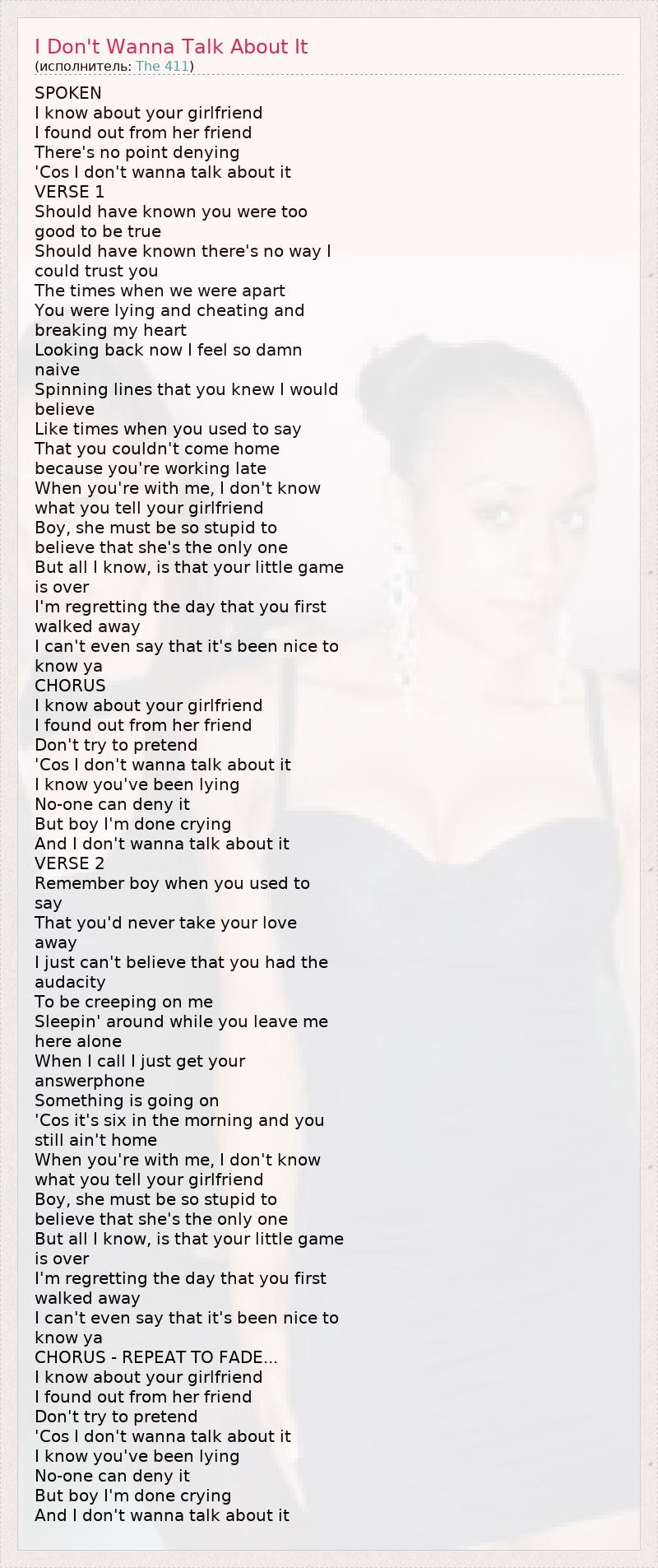 SPOKEN I know about your girlfriend I found out from her friend There's no point denying 'Cos I don't wanna talk about it VERSE 1 Should have known you were too good to be true Should have known there's no way I could trust you The times when we were apart You were lying and cheating and breaking my heart Looking back now I feel so damn naive Spinning lines that you knew I would believe Like times when you used to say That you couldn't come home because you're working late When you're with me, I don't know what you tell your girlfriend Boy, she must be so stupid to believe that she's the only one But all I know, is that your little game is over I'm regretting the day that you first walked away I can't even say that it's been nice to know ya CHORUS I know about your girlfriend I found out from her friend Don't try to pretend 'Cos I don't wanna talk about it I know you've been lying No-one can deny it But boy I'm done crying And I don't wanna talk about it VERSE 2 Remember boy when you used to say That you'd never take your love away I just can't believe that you had the audacity To be creeping on me Sleepin' around while you leave me here alone When I call I just get your answerphone Something is going on 'Cos it's six in the morning and you still ain't home When you're with me, I don't know what you tell your girlfriend Boy, she must be so stupid to believe that she's the only one But all I know, is that your little game is over I'm regretting the day that you first walked away I can't even say that it's been nice to know ya CHORUS - REPEAT TO FADE... I know about your girlfriend I found out from her friend Don't try to pretend 'Cos I don't wanna talk about it I know you've been lying No-one can deny it But boy I'm done crying And I don't wanna talk about it
