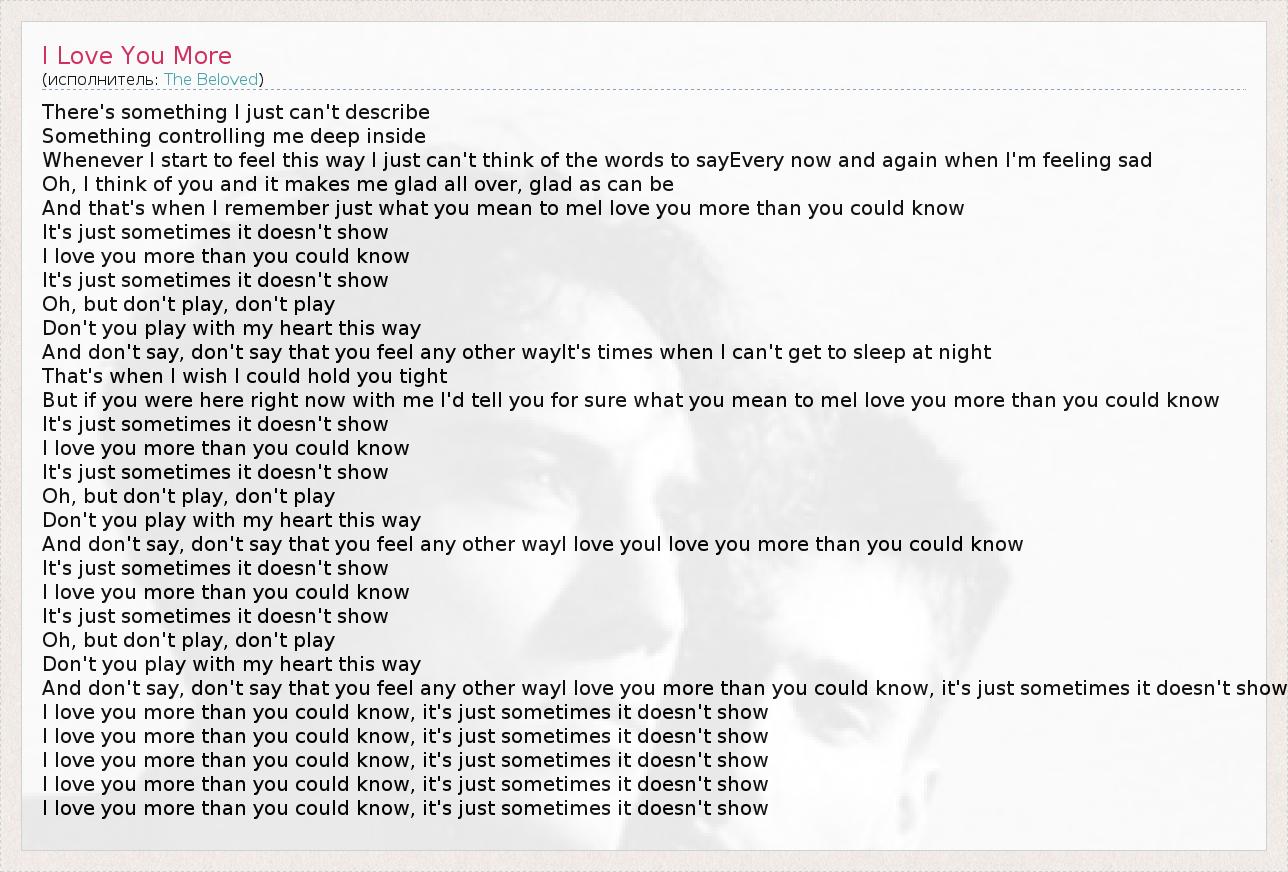 There's something I just can't describe Something controlling me deep inside Whenever I start to feel this way I just can't think of the words to sayEvery now and again when I'm feeling sad Oh, I think of you and it makes me glad all over, glad as can be And that's when I remember just what you mean to meI love you more than you could know It's just sometimes it doesn't show I love you more than you could know It's just sometimes it doesn't show Oh, but don't play, don't play Don't you play with my heart this way And don't say, don't say that you feel any other wayIt's times when I can't get to sleep at night That's when I wish I could hold you tight But if you were here right now with me I'd tell you for sure what you mean to meI love you more than you could know It's just sometimes it doesn't show I love you more than you could know It's just sometimes it doesn't show Oh, but don't play, don't play Don't you play with my heart this way And don't say, don't say that you feel any other wayI love youI love you more than you could know It's just sometimes it doesn't show I love you more than you could know It's just sometimes it doesn't show Oh, but don't play, don't play Don't you play with my heart this way And don't say, don't say that you feel any other wayI love you more than you could know, it's just sometimes it doesn't show I love you more than you could know, it's just sometimes it doesn't show I love you more than you could know, it's just sometimes it doesn't show I love you more than you could know, it's just sometimes it doesn't show I love you more than you could know, it's just sometimes it doesn't show I love you more than you could know, it's just sometimes it doesn't show