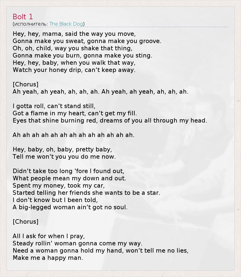 Hey, hey, mama, said the way you move, Gonna make you sweat, gonna make you groove. Oh, oh, child, way you shake that thing, Gonna make you burn, gonna make you sting. Hey, hey, baby, when you walk that way, Watch your honey drip, can't keep away. [Chorus] Ah yeah, ah yeah, ah, ah, ah. Ah yeah, ah yeah, ah, ah, ah. I gotta roll, can't stand still, Got a flame in my heart, can't get my fill. Eyes that shine burning red, dreams of you all through my head. Ah ah ah ah ah ah ah ah ah ah ah ah ah. Hey, baby, oh, baby, pretty baby, Tell me won't you you do me now. Didn't take too long 'fore I found out, What people mean my down and out. Spent my money, took my car, Started telling her friends she wants to be a star. I don't know but I been told, A big-legged woman ain't got no soul. [Chorus] All I ask for when I pray, Steady rollin' woman gonna come my way. Need a woman gonna hold my hand, won't tell me no lies, Make me a happy man.