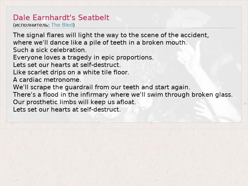 А как ты думаешь, о чем песня "Dale Earnhardt's Seatbelt" ?