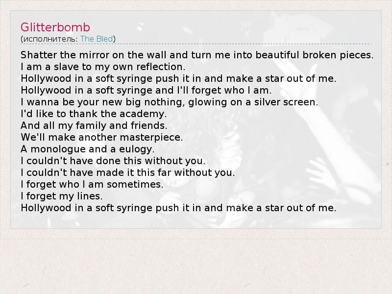 Shatter the mirror on the wall and turn me into beautiful broken pieces. I am a slave to my own reflection. Hollywood in a soft syringe push it in and make a star out of me. Hollywood in a soft syringe and I'll forget who I am. I wanna be your new big nothing, glowing on a silver screen. I'd like to thank the academy. And all my family and friends. We'll make another masterpiece. A monologue and a eulogy. I couldn't have done this without you. I couldn't have made it this far without you. I forget who I am sometimes. I forget my lines. Hollywood in a soft syringe push it in and make a star out of me.