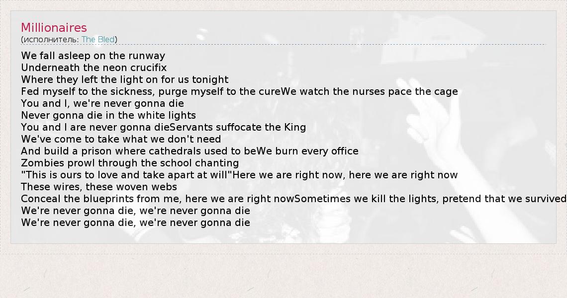 Это интересно:The Bled - металкор группа, образованная под названием "The Radiation Defiance Theory", но впоследствии сменившая его из-за слишком большой длины. Группа собралась в городе Туксон, штат Аризона, в 2001 году, из-за любви к музыке и желания выбраться из родного города. C тех пор они выпустили 4 альбома: "Pass the Flask", "Found In The Flood", "Silent Treatment" и самый последний "Heat Fetish", который вышел... продолжение