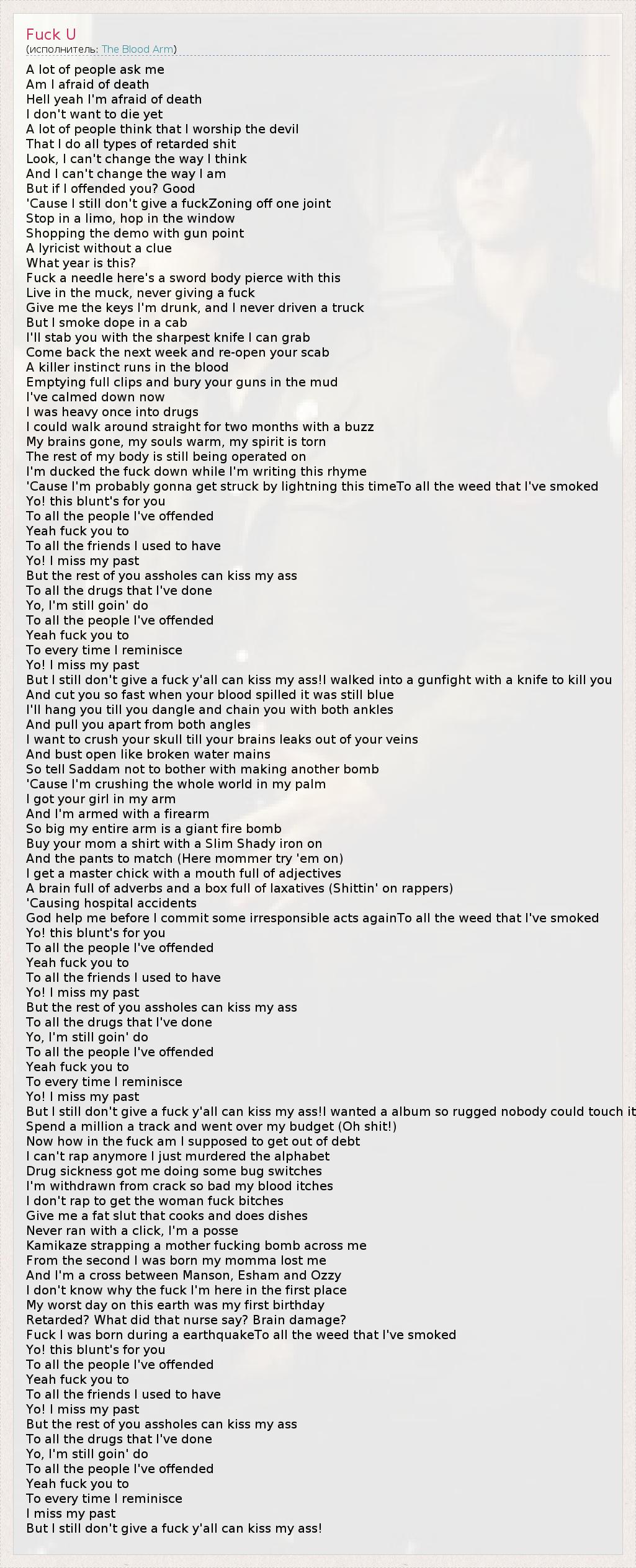 A lot of people ask me Am I afraid of death Hell yeah I'm afraid of death I don't want to die yet A lot of people think that I worship the devil That I do all types of retarded shit Look, I can't change the way I think And I can't change the way I am But if I offended you? Good 'Cause I still don't give a fuckZoning off one joint Stop in a limo, hop in the window Shopping the demo with gun point A lyricist without a clue What year is this? Fuck a needle here's a sword body pierce with this Live in the muck, never giving a fuck Give me the keys I'm drunk, and I never driven a truck But I smoke dope in a cab I'll stab you with the sharpest knife I can grab Come back the next week and re-open your scab A killer instinct runs in the blood Emptying full clips and bury your guns in the mud I've calmed down now I was heavy once into drugs I could walk around straight for two months with a buzz My brains gone, my souls warm, my spirit is torn The rest of my body is still being operated on I'm ducked the fuck down while I'm writing this rhyme 'Cause I'm probably gonna get struck by lightning this timeTo all the weed that I've smoked Yo! this blunt's for you To all the people I've offended Yeah fuck you to To all the friends I used to have Yo! I miss my past But the rest of you assholes can kiss my ass To all the drugs that I've done Yo, I'm still goin' do To all the people I've offended Yeah fuck you to To every time I reminisce Yo! I miss my past But I still don't give a fuck y'all can kiss my ass!I walked into a gunfight with a knife to kill you And cut you so fast when your blood spilled it was still blue I'll hang you till you dangle and chain you with both ankles And pull you apart from both angles I want to crush your skull till your brains leaks out of your veins And bust open like broken water mains So tell Saddam not to bother with making another bomb 'Cause I'm crushing the whole world in my palm I got your girl in my arm And I'm armed with a firearm So big my entire arm is a giant fire bomb Buy your mom a shirt with a Slim Shady iron on And the pants to match (Here mommer try 'em on) I get a master chick with a mouth full of adjectives A brain full of adverbs and a box full of laxatives (Shittin' on rappers) 'Causing hospital accidents God help me before I commit some irresponsible acts againTo all the weed that I've smoked Yo! this blunt's for you To all the people I've offended Yeah fuck you to To all the friends I used to have Yo! I miss my past But the rest of you assholes can kiss my ass To all the drugs that I've done Yo, I'm still goin' do To all the people I've offended Yeah fuck you to To every time I reminisce Yo! I miss my past But I still don't give a fuck y'all can kiss my ass!I wanted a album so rugged nobody could touch it Spend a million a track and went over my budget (Oh shit!) Now how in the fuck am I supposed to get out of debt I can't rap anymore I just murdered the alphabet Drug sickness got me doing some bug switches I'm withdrawn from crack so bad my blood itches I don't rap to get the woman fuck bitches Give me a fat slut that cooks and does dishes Never ran with a click, I'm a posse Kamikaze strapping a mother fucking bomb across me From the second I was born my momma lost me And I'm a cross between Manson, Esham and Ozzy I don't know why the fuck I'm here in the first place My worst day on this earth was my first birthday Retarded? What did that nurse say? Brain damage? Fuck I was born during a earthquakeTo all the weed that I've smoked Yo! this blunt's for you To all the people I've offended Yeah fuck you to To all the friends I used to have Yo! I miss my past But the rest of you assholes can kiss my ass To all the drugs that I've done Yo, I'm still goin' do To all the people I've offended Yeah fuck you to To every time I reminisce I miss my past But I still don't give a fuck y'all can kiss my ass!