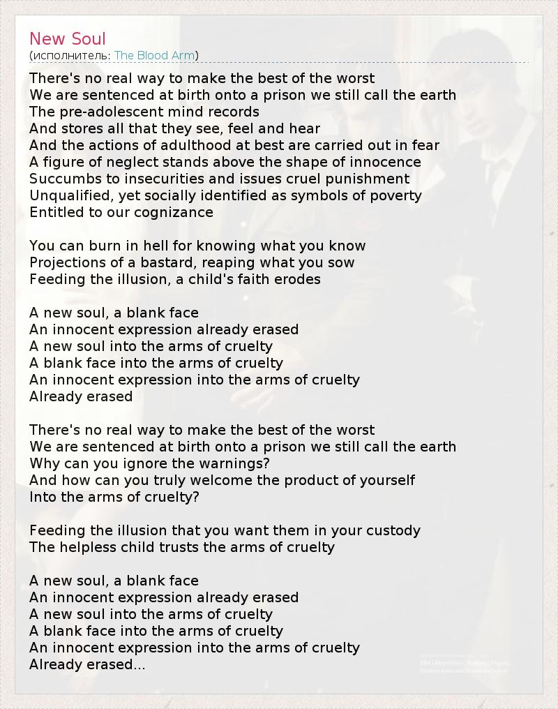 There's no real way to make the best of the worst We are sentenced at birth onto a prison we still call the earth The pre-adolescent mind records And stores all that they see, feel and hear And the actions of adulthood at best are carried out in fear A figure of neglect stands above the shape of innocence Succumbs to insecurities and issues cruel punishment Unqualified, yet socially identified as symbols of poverty Entitled to our cognizance You can burn in hell for knowing what you know Projections of a bastard, reaping what you sow Feeding the illusion, a child's faith erodes A new soul, a blank face An innocent expression already erased A new soul into the arms of cruelty A blank face into the arms of cruelty An innocent expression into the arms of cruelty Already erased There's no real way to make the best of the worst We are sentenced at birth onto a prison we still call the earth Why can you ignore the warnings? And how can you truly welcome the product of yourself Into the arms of cruelty? Feeding the illusion that you want them in your custody The helpless child trusts the arms of cruelty A new soul, a blank face An innocent expression already erased A new soul into the arms of cruelty A blank face into the arms of cruelty An innocent expression into the arms of cruelty Already erased...