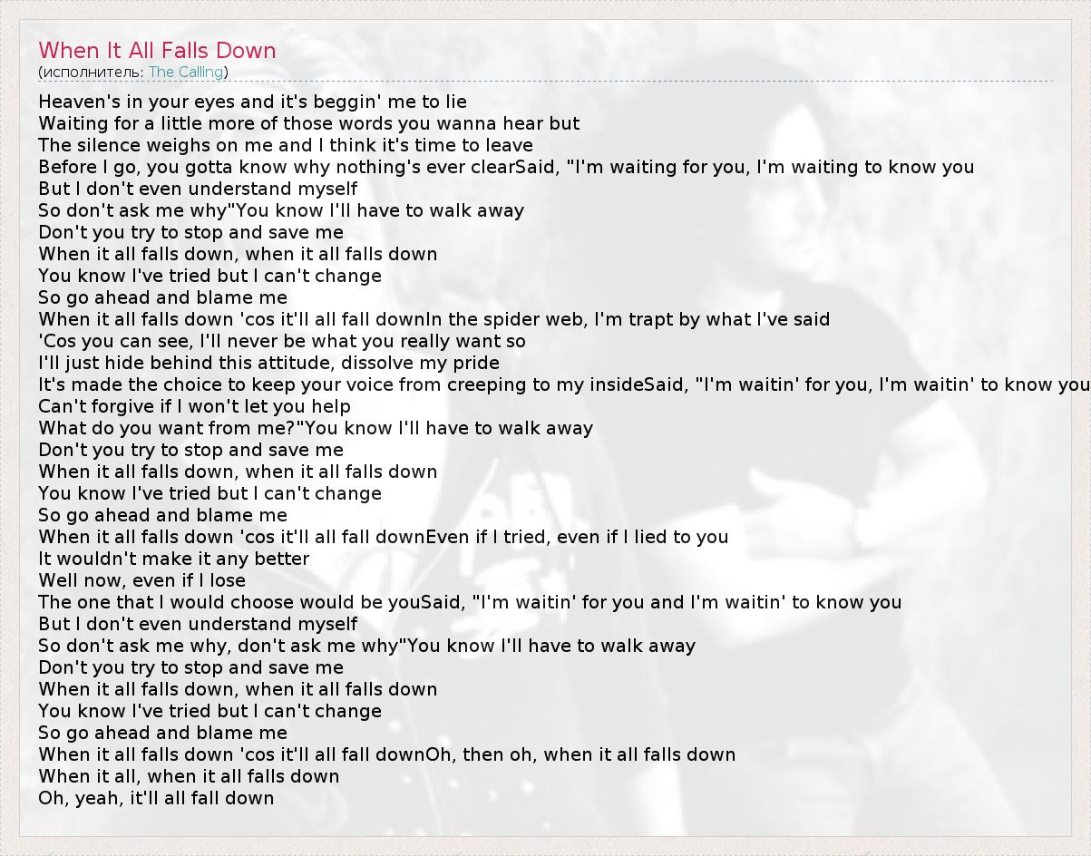 Heaven's in your eyes and it's beggin' me to lie Waiting for a little more of those words you wanna hear but The silence weighs on me and I think it's time to leave Before I go, you gotta know why nothing's ever clearSaid, "I'm waiting for you, I'm waiting to know you But I don't even understand myself So don't ask me why"You know I'll have to walk away Don't you try to stop and save me When it all falls down, when it all falls down You know I've tried but I can't change So go ahead and blame me When it all falls down 'cos it'll all fall downIn the spider web, I'm trapt by what I've said 'Cos you can see, I'll never be what you really want so I'll just hide behind this attitude, dissolve my pride It's made the choice to keep your voice from creeping to my insideSaid, "I'm waitin' for you, I'm waitin' to know you Can't forgive if I won't let you help What do you want from me?"You know I'll have to walk away Don't you try to stop and save me When it all falls down, when it all falls down You know I've tried but I can't change So go ahead and blame me When it all falls down 'cos it'll all fall downEven if I tried, even if I lied to you It wouldn't make it any better Well now, even if I lose The one that I would choose would be youSaid, "I'm waitin' for you and I'm waitin' to know you But I don't even understand myself So don't ask me why, don't ask me why"You know I'll have to walk away Don't you try to stop and save me When it all falls down, when it all falls down You know I've tried but I can't change So go ahead and blame me When it all falls down 'cos it'll all fall downOh, then oh, when it all falls down When it all, when it all falls down Oh, yeah, it'll all fall down