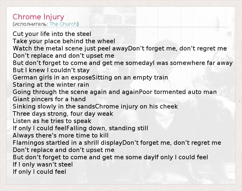 Watch the metal scene just peel awayDon't forget me, don't regret me