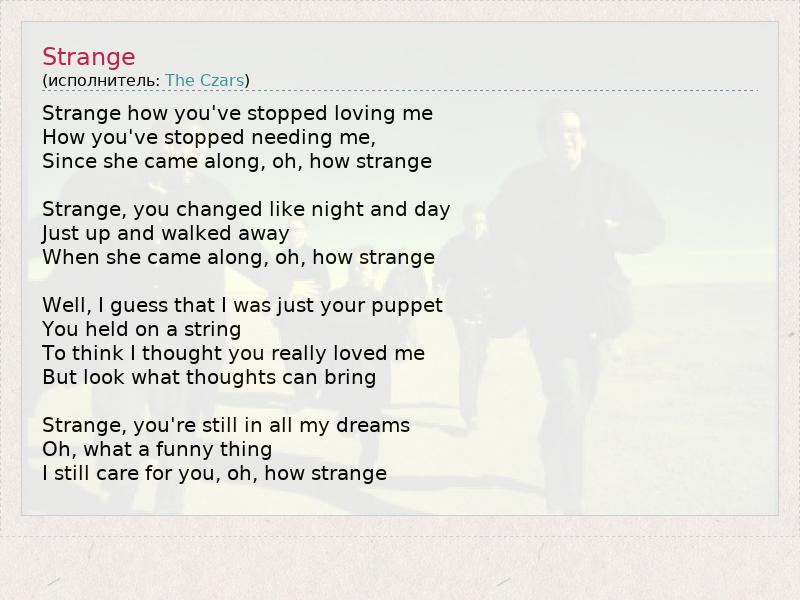 Strange how you've stopped loving me How you've stopped needing me, Since she came along, oh, how strange Strange, you changed like night and day Just up and walked away When she came along, oh, how strange Well, I guess that I was just your puppet You held on a string To think I thought you really loved me But look what thoughts can bring Strange, you're still in all my dreams Oh, what a funny thing I still care for you, oh, how strange