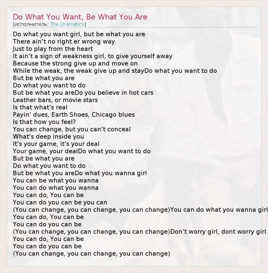 Do what you want girl, but be what you are There ain't no right er wrong way Just to play from the heart It ain't a sign of weakness girl, to give yourself away Because the strong give up and move on While the weak, the weak give up and stayDo what you want to do But be what you are Do what you want to do But be what you areDo you believe in hot cars Leather bars, or movie stars Is that what's real Payin' dues, Earth Shoes, Chicago blues Is that how you feel? You can change, but you can't conceal What's deep inside you It's your game, it's your deal Your game, your dealDo what you want to do But be what you are Do what you want to do But be what you areDo what you wanna girl You can be what you wanna You can do what you wanna You can do, You can be You can do you can be you can (You can change, you can change, you can change)You can do what you wanna girl You can do, You can be You can do you can be (You can change, you can change, you can change)Don't worry girl, dont worry girl. You can do, You can be You can do you can be (You can change, you can change, you can change)