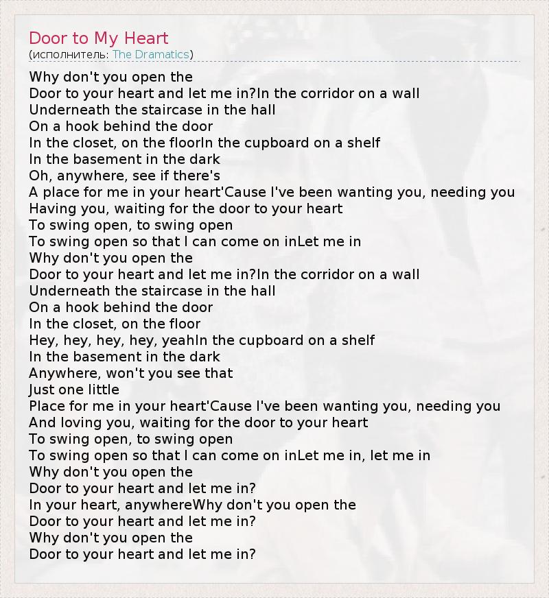 Why don't you open the Door to your heart and let me in?In the corridor on a wall Underneath the staircase in the hall On a hook behind the door In the closet, on the floorIn the cupboard on a shelf In the basement in the dark Oh, anywhere, see if there's A place for me in your heart'Cause I've been wanting you, needing you Having you, waiting for the door to your heart To swing open, to swing open To swing open so that I can come on inLet me in Why don't you open the Door to your heart and let me in?In the corridor on a wall Underneath the staircase in the hall On a hook behind the door In the closet, on the floor Hey, hey, hey, hey, yeahIn the cupboard on a shelf In the basement in the dark Anywhere, won't you see that Just one little Place for me in your heart'Cause I've been wanting you, needing you And loving you, waiting for the door to your heart To swing open, to swing open To swing open so that I can come on inLet me in, let me in Why don't you open the Door to your heart and let me in? In your heart, anywhereWhy don't you open the Door to your heart and let me in? Why don't you open the Door to your heart and let me in?