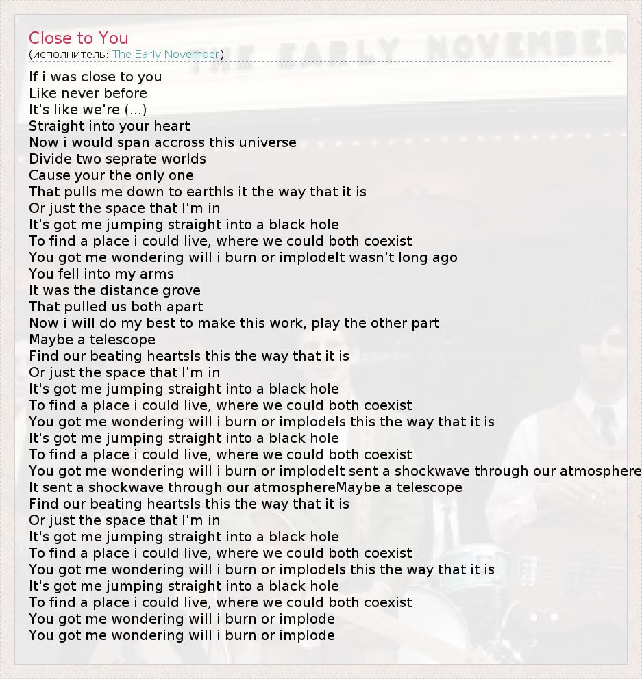 If i was close to you Like never before It's like we're (...) Straight into your heart Now i would span accross this universe Divide two seprate worlds Cause your the only one That pulls me down to earthIs it the way that it is Or just the space that I'm in It's got me jumping straight into a black hole To find a place i could live, where we could both coexist You got me wondering will i burn or implodeIt wasn't long ago You fell into my arms It was the distance grove That pulled us both apart Now i will do my best to make this work, play the other part Maybe a telescope Find our beating heartsIs this the way that it is Or just the space that I'm in It's got me jumping straight into a black hole To find a place i could live, where we could both coexist You got me wondering will i burn or implodeIs this the way that it is It's got me jumping straight into a black hole To find a place i could live, where we could both coexist You got me wondering will i burn or implodeIt sent a shockwave through our atmosphere It sent a shockwave through our atmosphereMaybe a telescope Find our beating heartsIs this the way that it is Or just the space that I'm in It's got me jumping straight into a black hole To find a place i could live, where we could both coexist You got me wondering will i burn or implodeIs this the way that it is It's got me jumping straight into a black hole To find a place i could live, where we could both coexist You got me wondering will i burn or implode You got me wondering will i burn or implode