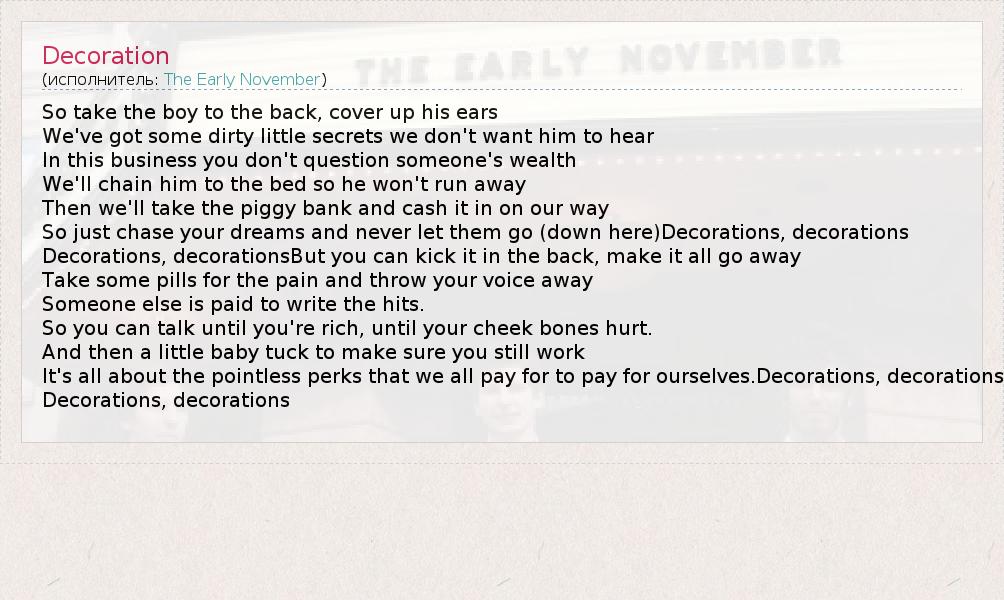 So take the boy to the back, cover up his ears We've got some dirty little secrets we don't want him to hear In this business you don't question someone's wealth We'll chain him to the bed so he won't run away Then we'll take the piggy bank and cash it in on our way So just chase your dreams and never let them go (down here)Decorations, decorations Decorations, decorationsBut you can kick it in the back, make it all go away Take some pills for the pain and throw your voice away Someone else is paid to write the hits. So you can talk until you're rich, until your cheek bones hurt. And then a little baby tuck to make sure you still work It's all about the pointless perks that we all pay for to pay for ourselves.Decorations, decorations Decorations, decorations