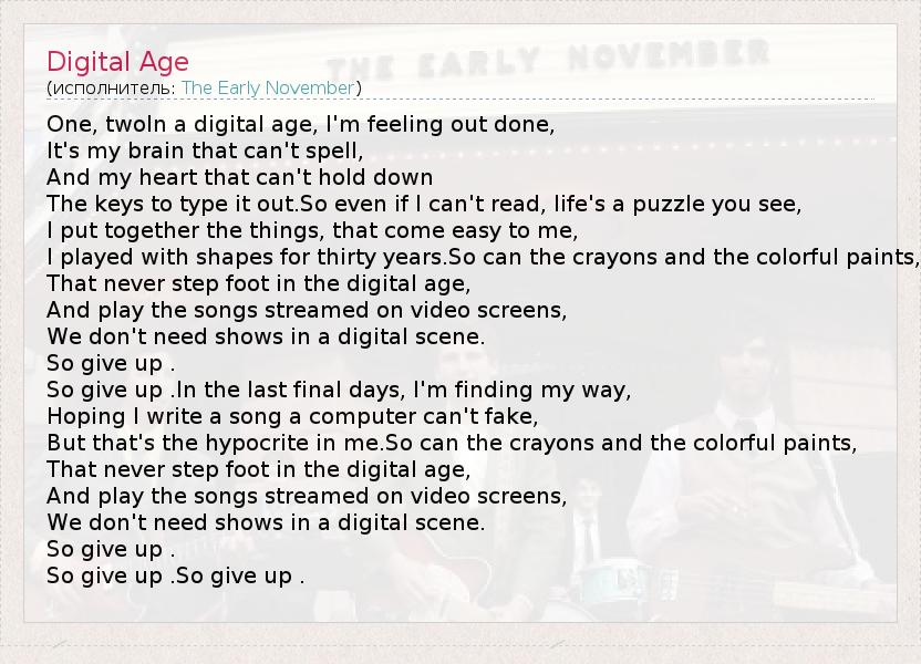 One, twoIn a digital age, I'm feeling out done, It's my brain that can't spell, And my heart that can't hold down The keys to type it out.So even if I can't read, life's a puzzle you see, I put together the things, that come easy to me, I played with shapes for thirty years.So can the crayons and the colorful paints, That never step foot in the digital age, And play the songs streamed on video screens, We don't need shows in a digital scene. So give up . So give up .In the last final days, I'm finding my way, Hoping I write a song a computer can't fake, But that's the hypocrite in me.So can the crayons and the colorful paints, That never step foot in the digital age, And play the songs streamed on video screens, We don't need shows in a digital scene. So give up . So give up .So give up .