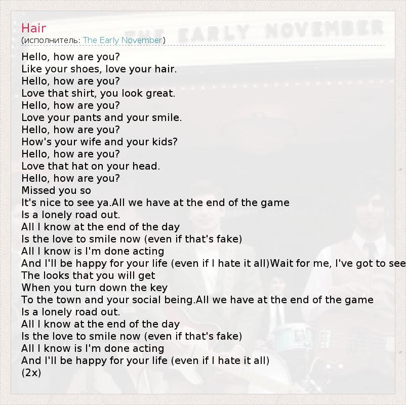 Hello, how are you? Like your shoes, love your hair. Hello, how are you? Love that shirt, you look great. Hello, how are you? Love your pants and your smile. Hello, how are you? How's your wife and your kids? Hello, how are you? Love that hat on your head. Hello, how are you? Missed you so It's nice to see ya.All we have at the end of the game Is a lonely road out. All I know at the end of the day Is the love to smile now (even if that's fake) All I know is I'm done acting And I'll be happy for your life (even if I hate it all)Wait for me, I've got to see The looks that you will get When you turn down the key To the town and your social being.All we have at the end of the game Is a lonely road out. All I know at the end of the day Is the love to smile now (even if that's fake) All I know is I'm done acting And I'll be happy for your life (even if I hate it all) (2x)
