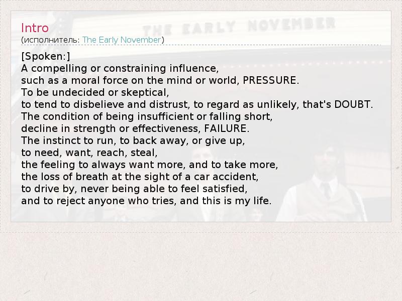 [Spoken:] A compelling or constraining influence, such as a moral force on the mind or world, PRESSURE. To be undecided or skeptical, to tend to disbelieve and distrust, to regard as unlikely, that's DOUBT. The condition of being insufficient or falling short, decline in strength or effectiveness, FAILURE. The instinct to run, to back away, or give up, to need, want, reach, steal, the feeling to always want more, and to take more, the loss of breath at the sight of a car accident, to drive by, never being able to feel satisfied, and to reject anyone who tries, and this is my life.