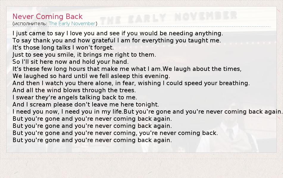 А как ты думаешь, о чем песня "Never Coming Back" ?