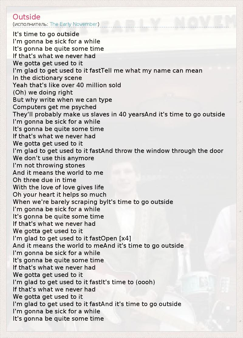It's time to go outside I'm gonna be sick for a while It's gonna be quite some time If that's what we never had We gotta get used to it I'm glad to get used to it fastTell me what my name can mean In the dictionary scene Yeah that's like over 40 million sold (Oh) we doing right But why write when we can type Computers get me psyched They'll probably make us slaves in 40 yearsAnd it's time to go outside I'm gonna be sick for a while It's gonna be quite some time If that's what we never had We gotta get used to it I'm glad to get used to it fastAnd throw the window through the door We don't use this anymore I'm not throwing stones And it means the world to me Oh three due in time With the love of love gives life Oh your heart it helps so much When we're barely scraping byIt's time to go outside I'm gonna be sick for a while It's gonna be quite some time If that's what we never had We gotta get used to it I'm glad to get used to it fastOpen [x4] And it means the world to meAnd it's time to go outside I'm gonna be sick for a while It's gonna be quite some time If that's what we never had We gotta get used to it I'm glad to get used to it fastIt's time to (oooh) If that's what we never had We gotta get used to it I'm glad to get used to it fastAnd it's time to go outside I'm gonna be sick for a while It's gonna be quite some time