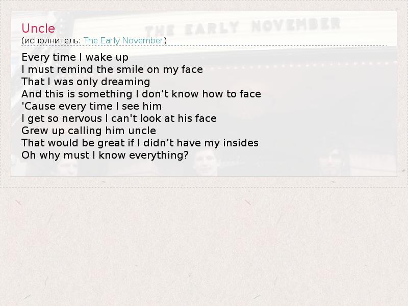 Every time I wake up I must remind the smile on my face That I was only dreaming And this is something I don't know how to face 'Cause every time I see him I get so nervous I can't look at his face Grew up calling him uncle That would be great if I didn't have my insides Oh why must I know everything?