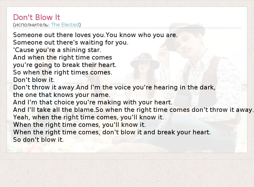 Someone out there loves you.You know who you are. Someone out there's waiting for you. 'Cause you're a shining star. And when the right time comes you're going to break their heart. So when the right times comes. Don't blow it. Don't throw it away.And I'm the voice you're hearing in the dark, the one that knows your name. And I'm that choice you're making with your heart. And I'll take all the blame.So when the right time comes don't throw it away. Yeah, when the right time comes, you'll know it. When the right time comes, you'll know it. When the right time comes, don't blow it and break your heart. So don't blow it.