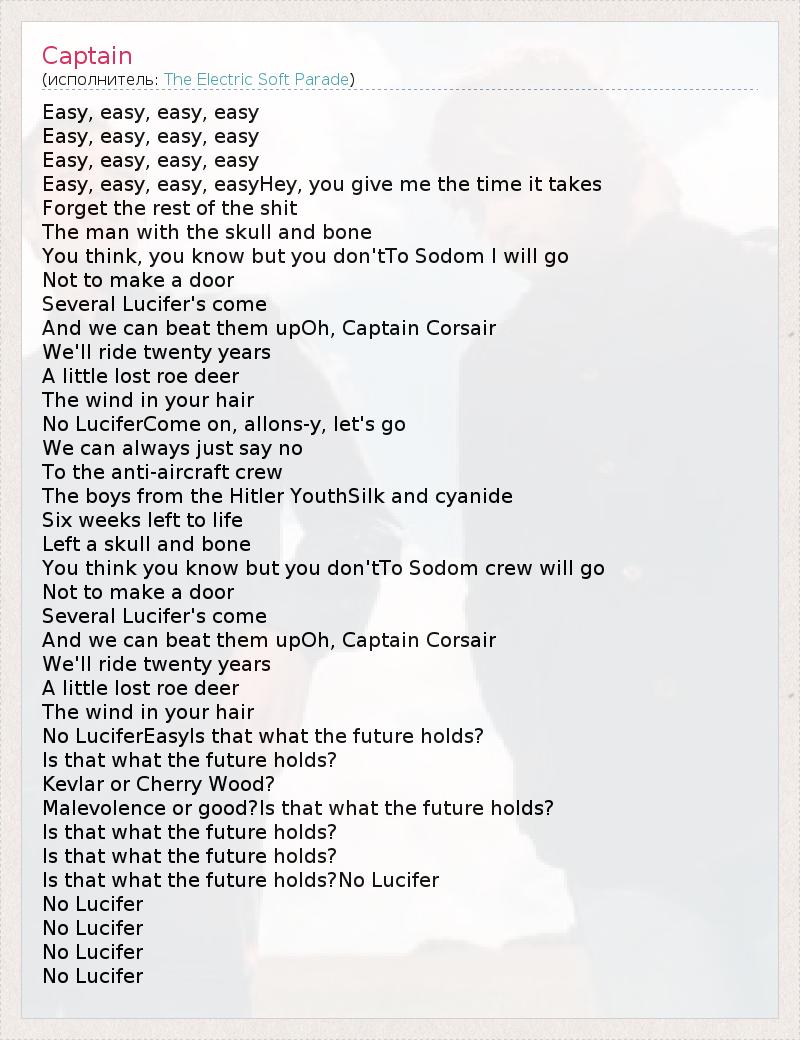 Easy, easy, easy, easy Easy, easy, easy, easy Easy, easy, easy, easy Easy, easy, easy, easyHey, you give me the time it takes Forget the rest of the shit The man with the skull and bone You think, you know but you don'tTo Sodom I will go Not to make a door Several Lucifer's come And we can beat them upOh, Captain Corsair We'll ride twenty years A little lost roe deer The wind in your hair No LuciferCome on, allons-y, let's go We can always just say no To the anti-aircraft crew The boys from the Hitler YouthSilk and cyanide Six weeks left to life Left a skull and bone You think you know but you don'tTo Sodom crew will go Not to make a door Several Lucifer's come And we can beat them upOh, Captain Corsair We'll ride twenty years A little lost roe deer The wind in your hair No LuciferEasyIs that what the future holds? Is that what the future holds? Kevlar or Cherry Wood? Malevolence or good?Is that what the future holds? Is that what the future holds? Is that what the future holds? Is that what the future holds?No Lucifer No Lucifer No Lucifer No Lucifer No Lucifer