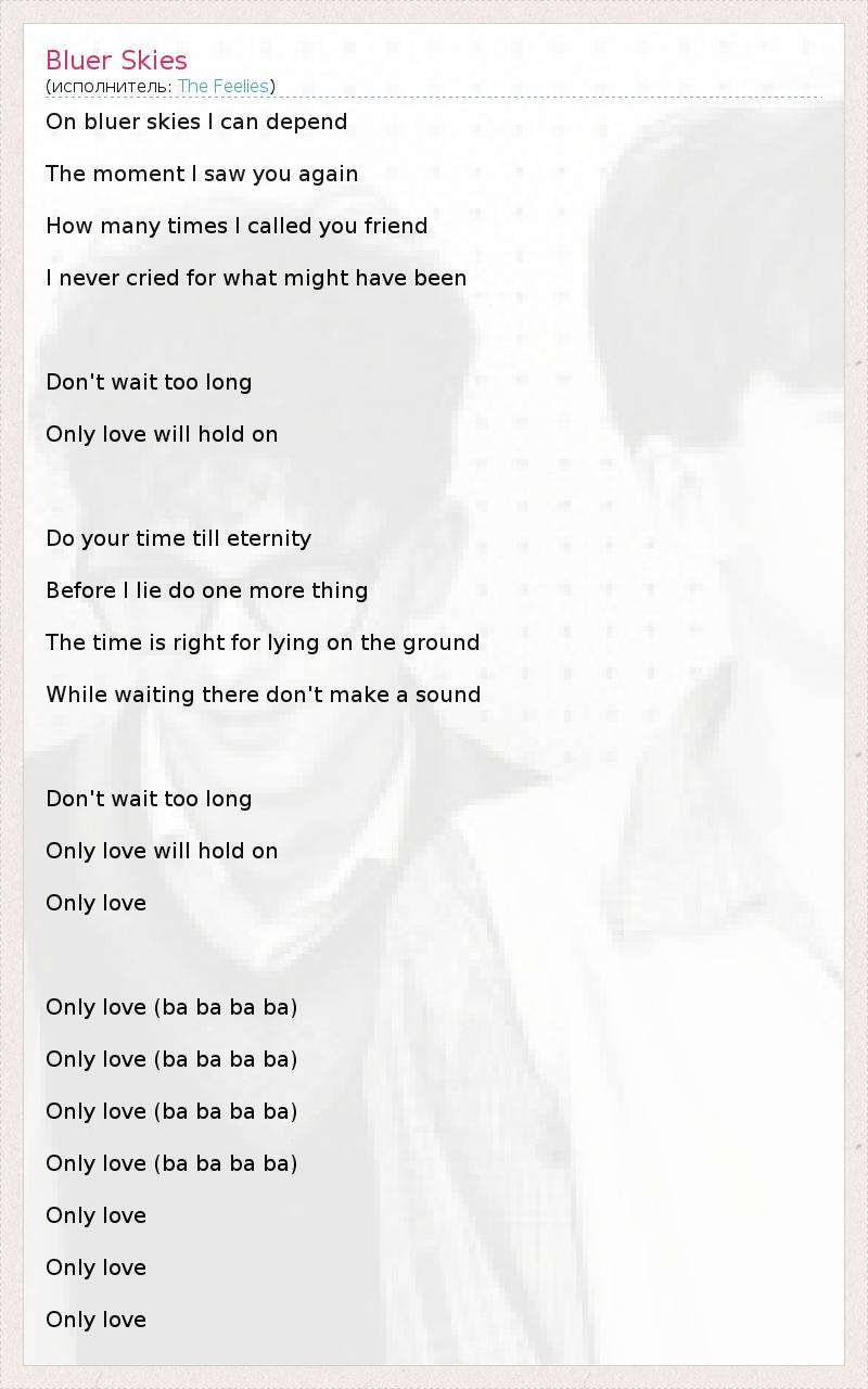 On bluer skies I can depend The moment I saw you again How many times I called you friend I never cried for what might have been Don't wait too long Only love will hold on Do your time till eternity Before I lie do one more thing The time is right for lying on the ground While waiting there don't make a sound Don't wait too long Only love will hold on Only love Only love (ba ba ba ba) Only love (ba ba ba ba) Only love (ba ba ba ba) Only love (ba ba ba ba) Only love Only love Only love