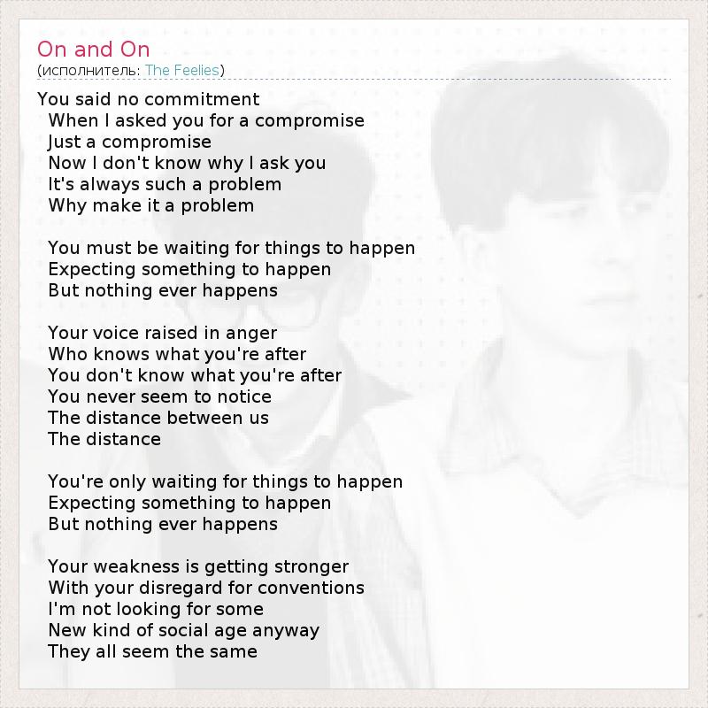 You said no commitment When I asked you for a compromise Just a compromise Now I don't know why I ask you It's always such a problem Why make it a problem You must be waiting for things to happen Expecting something to happen But nothing ever happens Your voice raised in anger Who knows what you're after You don't know what you're after You never seem to notice The distance between us The distance You're only waiting for things to happen Expecting something to happen But nothing ever happens Your weakness is getting stronger With your disregard for conventions I'm not looking for some New kind of social age anyway They all seem the same