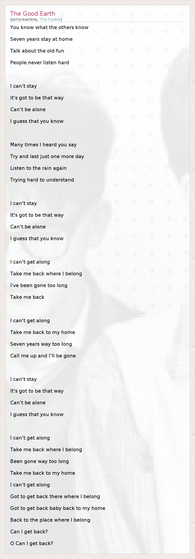 You know what the others know Seven years stay at home Talk about the old fun People never listen hard I can't stay It's got to be that way Can't be alone I guess that you know Many times I heard you say Try and last just one more day Listen to the rain again Trying hard to understand I can't stay It's got to be that way Can't be alone I guess that you know I can't get along Take me back where I belong I've been gone too long Take me back I can't get along Take me back to my home Seven years way too long Call me up and I'll be gone I can't stay It's got to be that way Can't be alone I guess that you know I can't get along Take me back where I belong Been gone way too long Take me back to my home I can't get along Got to get back there where I belong Got to get back baby back to my home Back to the place where I belong Can I get back? O Can I get back?