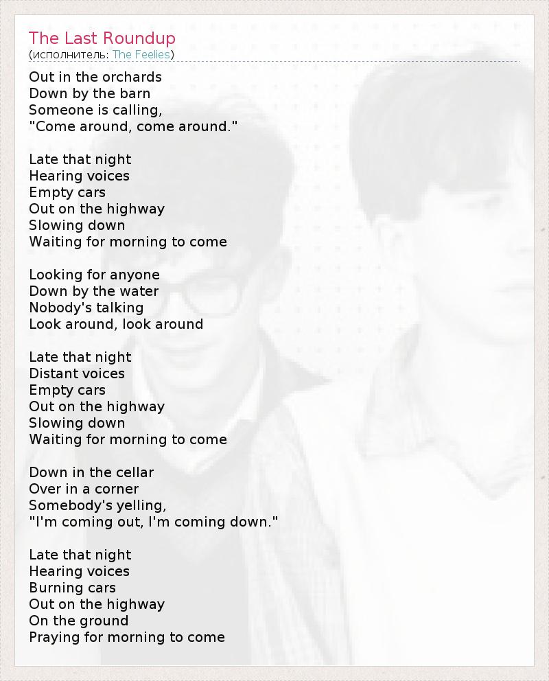 Out in the orchards Down by the barn Someone is calling, "Come around, come around." Late that night Hearing voices Empty cars Out on the highway Slowing down Waiting for morning to come Looking for anyone Down by the water Nobody's talking Look around, look around Late that night Distant voices Empty cars Out on the highway Slowing down Waiting for morning to come Down in the cellar Over in a corner Somebody's yelling, "I'm coming out, I'm coming down." Late that night Hearing voices Burning cars Out on the highway On the ground Praying for morning to come
