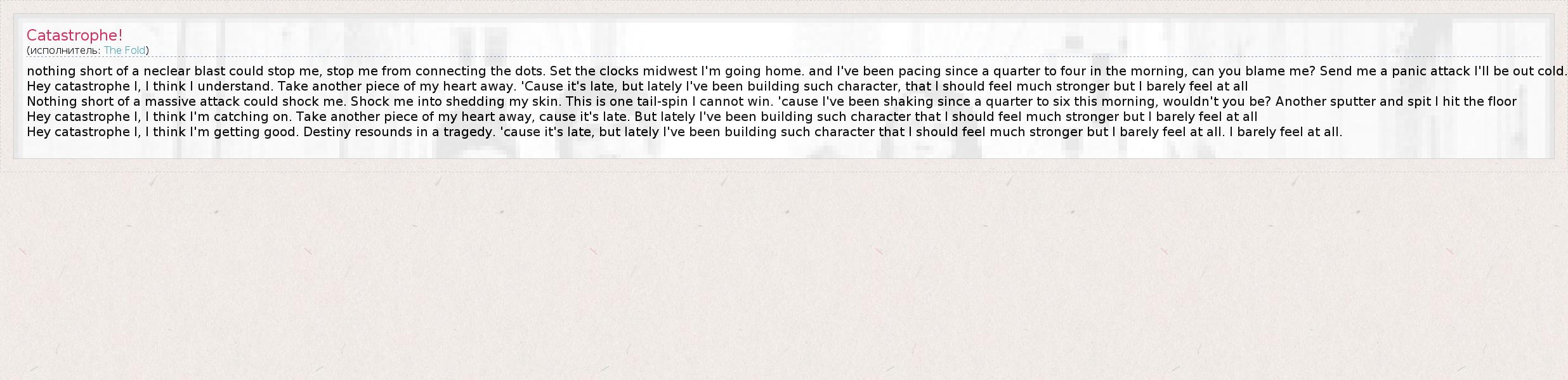 nothing short of a neclear blast could stop me, stop me from connecting the dots. Set the clocks midwest I'm going home. and I've been pacing since a quarter to four in the morning, can you blame me? Send me a panic attack I'll be out cold. Hey catastrophe I, I think I understand. Take another piece of my heart away. 'Cause it's late, but lately I've been building such character, that I should feel much stronger but I barely feel at all Nothing short of a massive attack could shock me. Shock me into shedding my skin. This is one tail-spin I cannot win. 'cause I've been shaking since a quarter to six this morning, wouldn't you be? Another sputter and spit I hit the floor Hey catastrophe I, I think I'm catching on. Take another piece of my heart away, cause it's late. But lately I've been building such character that I should feel much stronger but I barely feel at all Hey catastrophe I, I think I'm getting good. Destiny resounds in a tragedy. 'cause it's late, but lately I've been building such character that I should feel much stronger but I barely feel at all. I barely feel at all.