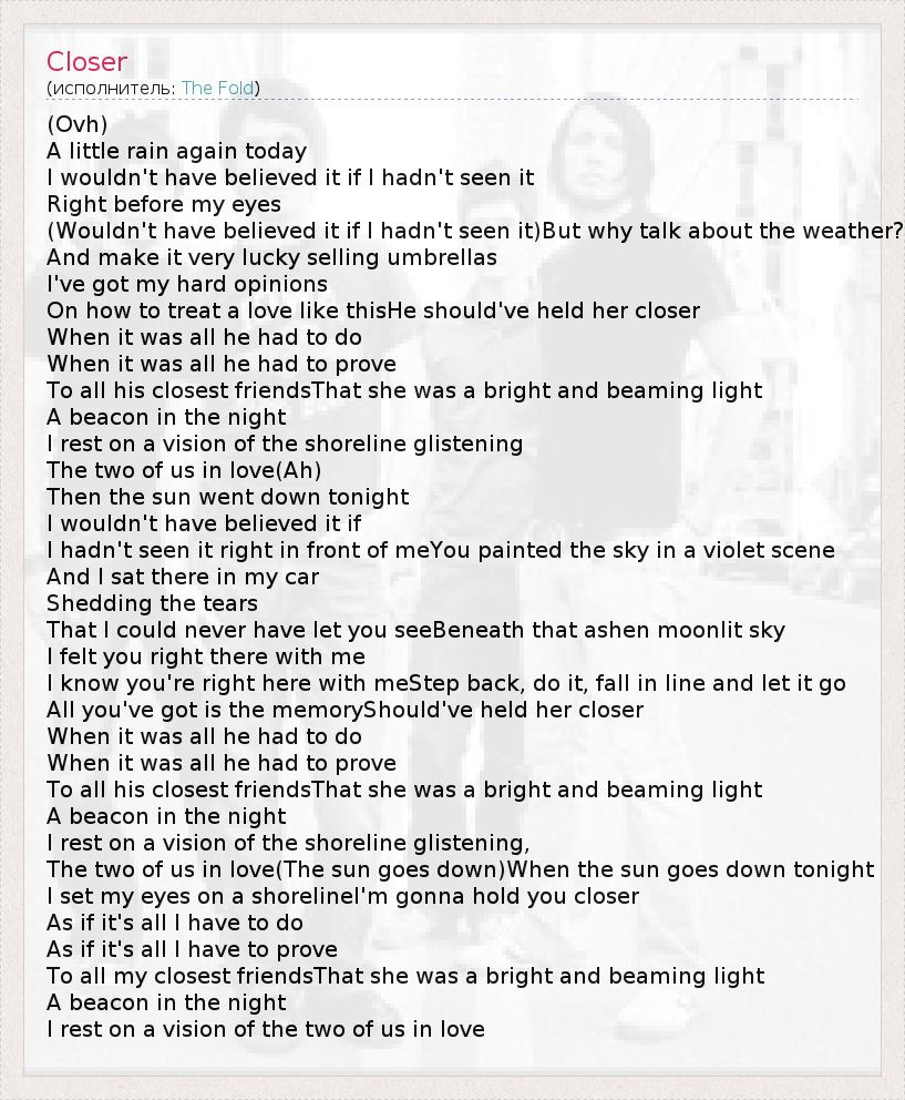 (Ovh) A little rain again today I wouldn't have believed it if I hadn't seen it Right before my eyes (Wouldn't have believed it if I hadn't seen it)But why talk about the weather? And make it very lucky selling umbrellas I've got my hard opinions On how to treat a love like thisHe should've held her closer When it was all he had to do When it was all he had to prove To all his closest friendsThat she was a bright and beaming light A beacon in the night I rest on a vision of the shoreline glistening The two of us in love(Ah) Then the sun went down tonight I wouldn't have believed it if I hadn't seen it right in front of meYou painted the sky in a violet scene And I sat there in my car Shedding the tears That I could never have let you seeBeneath that ashen moonlit sky I felt you right there with me I know you're right here with meStep back, do it, fall in line and let it go All you've got is the memoryShould've held her closer When it was all he had to do When it was all he had to prove To all his closest friendsThat she was a bright and beaming light A beacon in the night I rest on a vision of the shoreline glistening, The two of us in love(The sun goes down)When the sun goes down tonight I set my eyes on a shorelineI'm gonna hold you closer As if it's all I have to do As if it's all I have to prove To all my closest friendsThat she was a bright and beaming light A beacon in the night I rest on a vision of the two of us in love