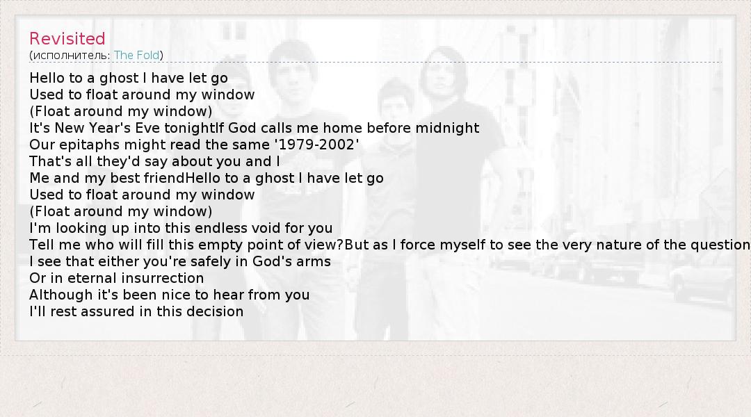Hello to a ghost I have let go Used to float around my window (Float around my window) It's New Year's Eve tonightIf God calls me home before midnight Our epitaphs might read the same '1979-2002' That's all they'd say about you and I Me and my best friendHello to a ghost I have let go Used to float around my window (Float around my window) I'm looking up into this endless void for you Tell me who will fill this empty point of view?But as I force myself to see the very nature of the question I see that either you're safely in God's arms Or in eternal insurrection Although it's been nice to hear from you I'll rest assured in this decision
