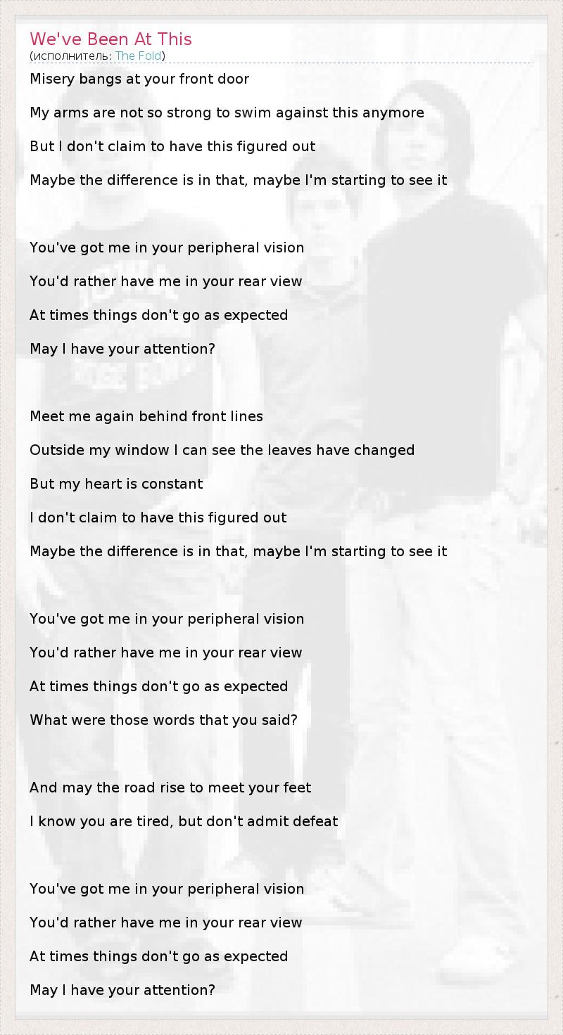 Misery bangs at your front door My arms are not so strong to swim against this anymore But I don't claim to have this figured out Maybe the difference is in that, maybe I'm starting to see it You've got me in your peripheral vision You'd rather have me in your rear view At times things don't go as expected May I have your attention? Meet me again behind front lines Outside my window I can see the leaves have changed But my heart is constant I don't claim to have this figured out Maybe the difference is in that, maybe I'm starting to see it You've got me in your peripheral vision You'd rather have me in your rear view At times things don't go as expected What were those words that you said? And may the road rise to meet your feet I know you are tired, but don't admit defeat You've got me in your peripheral vision You'd rather have me in your rear view At times things don't go as expected May I have your attention?