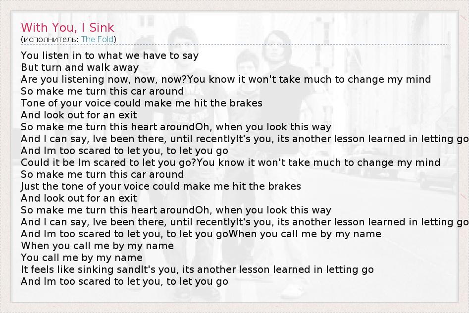 You listen in to what we have to say But turn and walk away Are you listening now, now, now?You know it won't take much to change my mind So make me turn this car around Tone of your voice could make me hit the brakes And look out for an exit So make me turn this heart aroundOh, when you look this way And I can say, Ive been there, until recentlyIt's you, its another lesson learned in letting go And Im too scared to let you, to let you go Could it be Im scared to let you go?You know it won't take much to change my mind So make me turn this car around Just the tone of your voice could make me hit the brakes And look out for an exit So make me turn this heart aroundOh, when you look this way And I can say, Ive been there, until recentlyIt's you, its another lesson learned in letting go And Im too scared to let you, to let you goWhen you call me by my name When you call me by my name You call me by my name It feels like sinking sandIt's you, its another lesson learned in letting go And Im too scared to let you, to let you go