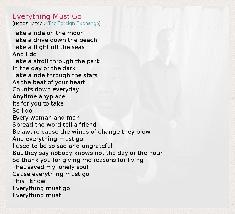 Take a ride on the moon Take a drive down the beach Take a flight off the seas And I do Take a stroll through the park In the day or the dark Take a ride through the stars As the beat of your heart Counts down everyday Anytime anyplace Its for you to take So I do Every woman and man Spread the word tell a friend Be aware cause the winds of change they blow And everything must go I used to be so sad and ungrateful But they say nobody knows not the day or the hour So thank you for giving me reasons for living That saved my lonely soul Cause everything must go This I know Everything must go Everything must