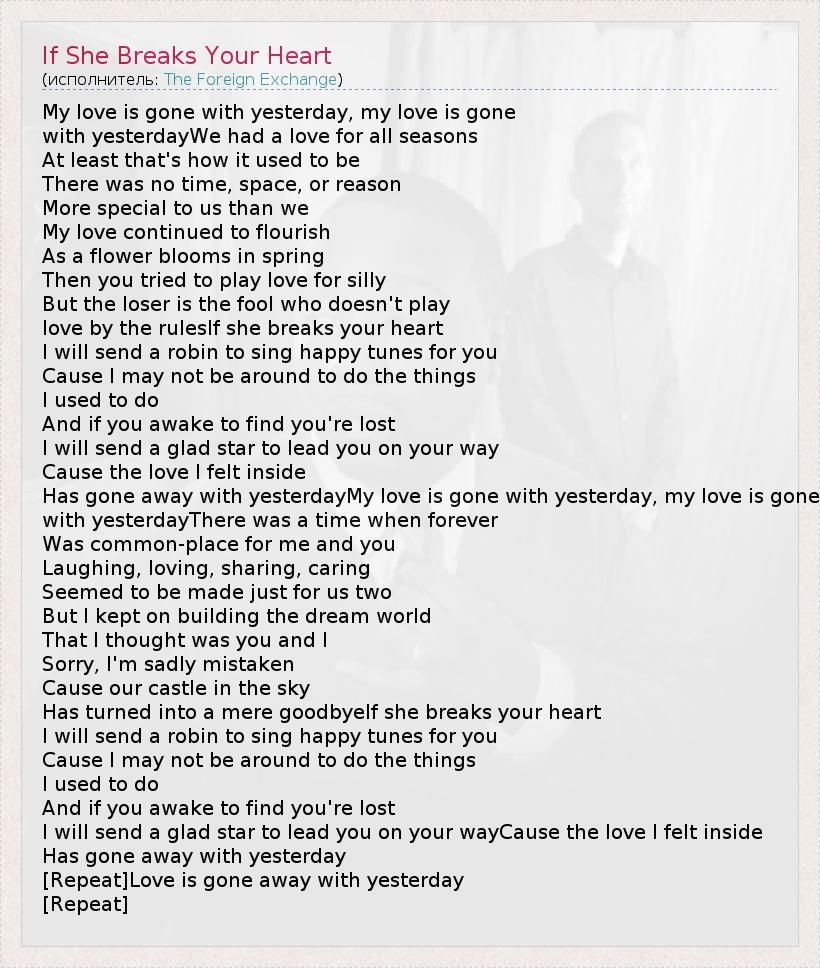 My love is gone with yesterday, my love is gone with yesterdayWe had a love for all seasons At least that's how it used to be There was no time, space, or reason More special to us than we My love continued to flourish As a flower blooms in spring Then you tried to play love for silly But the loser is the fool who doesn't play love by the rulesIf she breaks your heart I will send a robin to sing happy tunes for you Cause I may not be around to do the things I used to do And if you awake to find you're lost I will send a glad star to lead you on your way Cause the love I felt inside Has gone away with yesterdayMy love is gone with yesterday, my love is gone with yesterdayThere was a time when forever Was common-place for me and you Laughing, loving, sharing, caring Seemed to be made just for us two But I kept on building the dream world That I thought was you and I Sorry, I'm sadly mistaken Cause our castle in the sky Has turned into a mere goodbyeIf she breaks your heart I will send a robin to sing happy tunes for you Cause I may not be around to do the things I used to do And if you awake to find you're lost I will send a glad star to lead you on your wayCause the love I felt inside Has gone away with yesterday [Repeat]Love is gone away with yesterday [Repeat]
