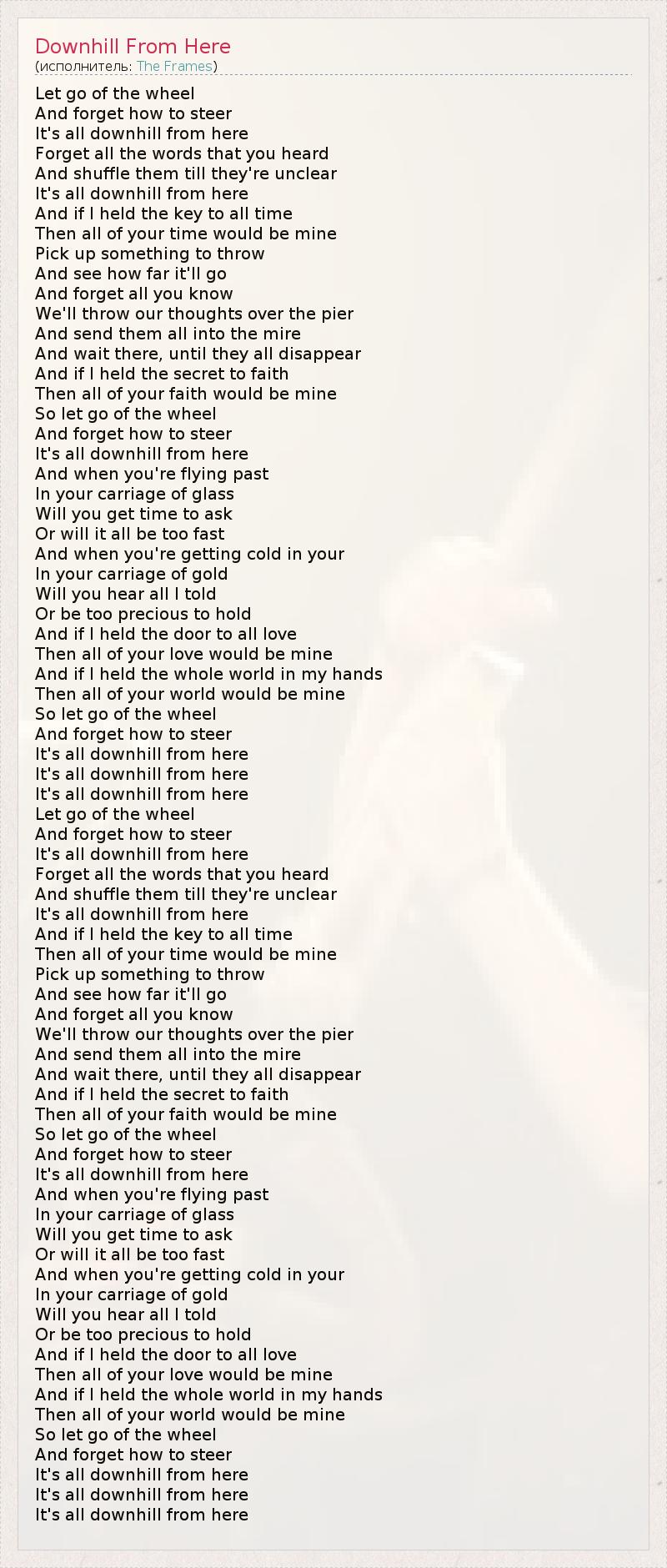 Let go of the wheel And forget how to steer It's all downhill from here Forget all the words that you heard And shuffle them till they're unclear It's all downhill from here And if I held the key to all time Then all of your time would be mine Pick up something to throw And see how far it'll go And forget all you know We'll throw our thoughts over the pier And send them all into the mire And wait there, until they all disappear And if I held the secret to faith Then all of your faith would be mine So let go of the wheel And forget how to steer It's all downhill from here And when you're flying past In your carriage of glass Will you get time to ask Or will it all be too fast And when you're getting cold in your In your carriage of gold Will you hear all I told Or be too precious to hold And if I held the door to all love Then all of your love would be mine And if I held the whole world in my hands Then all of your world would be mine So let go of the wheel And forget how to steer It's all downhill from here It's all downhill from here It's all downhill from here Let go of the wheel And forget how to steer It's all downhill from here Forget all the words that you heard And shuffle them till they're unclear It's all downhill from here And if I held the key to all time Then all of your time would be mine Pick up something to throw And see how far it'll go And forget all you know We'll throw our thoughts over the pier And send them all into the mire And wait there, until they all disappear And if I held the secret to faith Then all of your faith would be mine So let go of the wheel And forget how to steer It's all downhill from here And when you're flying past In your carriage of glass Will you get time to ask Or will it all be too fast And when you're getting cold in your In your carriage of gold Will you hear all I told Or be too precious to hold And if I held the door to all love Then all of your love would be mine And if I held the whole world in my hands Then all of your world would be mine So let go of the wheel And forget how to steer It's all downhill from here It's all downhill from here It's all downhill from here
