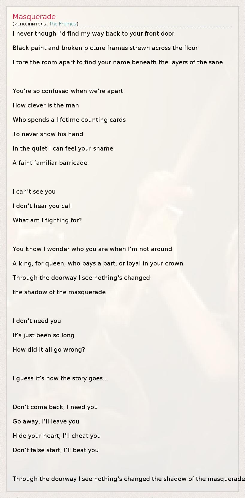 I never though I'd find my way back to your front door Black paint and broken picture frames strewn across the floor I tore the room apart to find your name beneath the layers of the sane You're so confused when we're apart How clever is the man Who spends a lifetime counting cards To never show his hand In the quiet I can feel your shame A faint familiar barricade I can't see you I don't hear you call What am I fighting for? You know I wonder who you are when I'm not around A king, for queen, who pays a part, or loyal in your crown Through the doorway I see nothing's changed the shadow of the masquerade I don't need you It's just been so long How did it all go wrong? I guess it's how the story goes... Don't come back, I need you Go away, I'll leave you Hide your heart, I'll cheat you Don't false start, I'll beat you Through the doorway I see nothing's changed the shadow of the masquerade