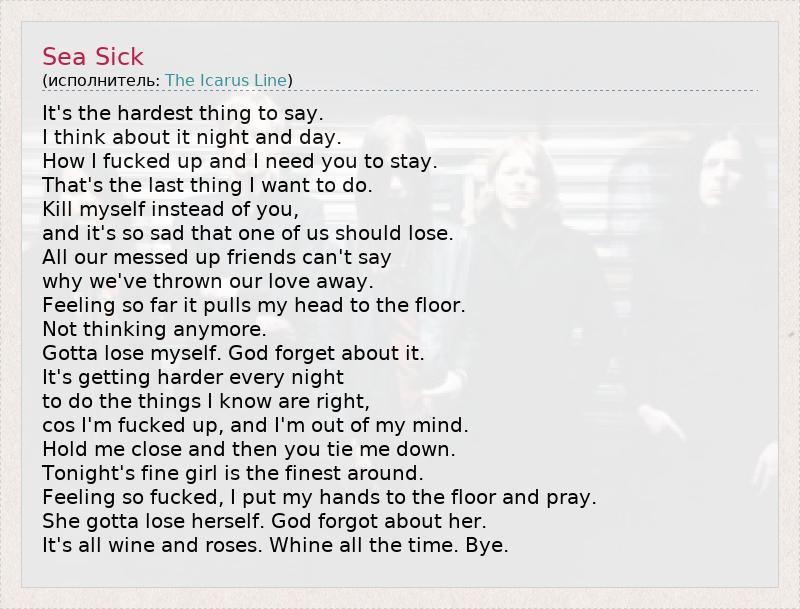 It's the hardest thing to say. I think about it night and day. How I fucked up and I need you to stay. That's the last thing I want to do. Kill myself instead of you, and it's so sad that one of us should lose. All our messed up friends can't say why we've thrown our love away. Feeling so far it pulls my head to the floor. Not thinking anymore. Gotta lose myself. God forget about it. It's getting harder every night to do the things I know are right, cos I'm fucked up, and I'm out of my mind. Hold me close and then you tie me down. Tonight's fine girl is the finest around. Feeling so fucked, I put my hands to the floor and pray. She gotta lose herself. God forgot about her. It's all wine and roses. Whine all the time. Bye.