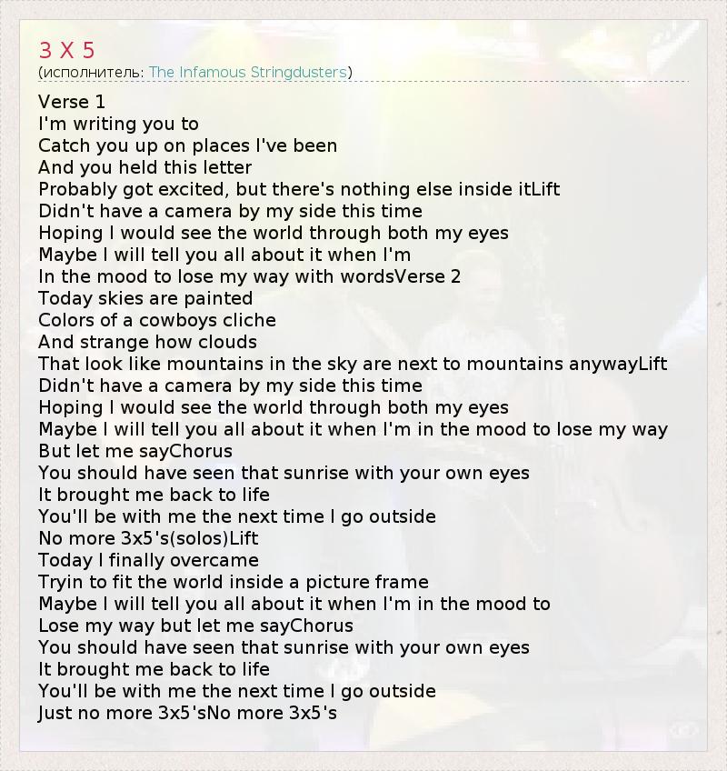 Verse 1 I'm writing you to Catch you up on places I've been And you held this letter Probably got excited, but there's nothing else inside itLift Didn't have a camera by my side this time Hoping I would see the world through both my eyes Maybe I will tell you all about it when I'm In the mood to lose my way with wordsVerse 2 Today skies are painted Colors of a cowboys cliche And strange how clouds That look like mountains in the sky are next to mountains anywayLift Didn't have a camera by my side this time Hoping I would see the world through both my eyes Maybe I will tell you all about it when I'm in the mood to lose my way But let me sayChorus You should have seen that sunrise with your own eyes It brought me back to life You'll be with me the next time I go outside No more 3x5's(solos)Lift Today I finally overcame Tryin to fit the world inside a picture frame Maybe I will tell you all about it when I'm in the mood to Lose my way but let me sayChorus You should have seen that sunrise with your own eyes It brought me back to life You'll be with me the next time I go outside Just no more 3x5'sNo more 3x5's