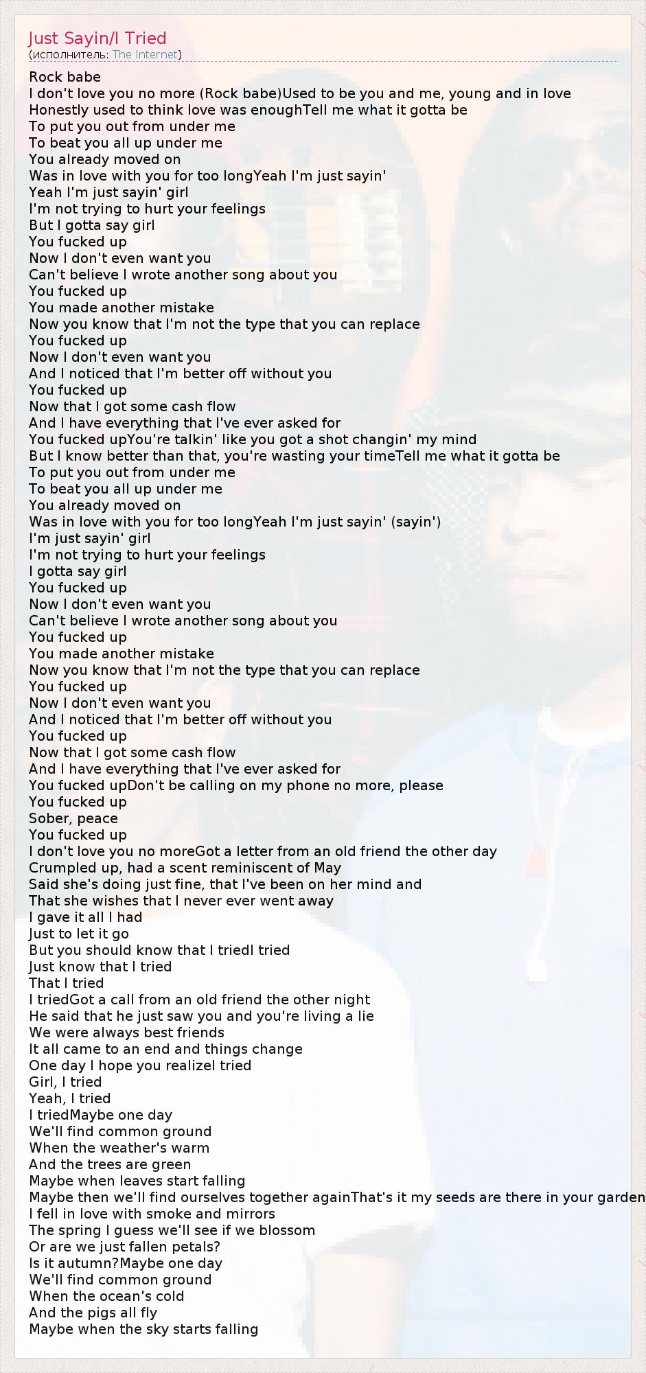 Rock babe I don't love you no more (Rock babe)Used to be you and me, young and in love Honestly used to think love was enoughTell me what it gotta be To put you out from under me To beat you all up under me You already moved on Was in love with you for too longYeah I'm just sayin' Yeah I'm just sayin' girl I'm not trying to hurt your feelings But I gotta say girl You fucked up Now I don't even want you Can't believe I wrote another song about you You fucked up You made another mistake Now you know that I'm not the type that you can replace You fucked up Now I don't even want you And I noticed that I'm better off without you You fucked up Now that I got some cash flow And I have everything that I've ever asked for You fucked upYou're talkin' like you got a shot changin' my mind But I know better than that, you're wasting your timeTell me what it gotta be To put you out from under me To beat you all up under me You already moved on Was in love with you for too longYeah I'm just sayin' (sayin') I'm just sayin' girl I'm not trying to hurt your feelings I gotta say girl You fucked up Now I don't even want you Can't believe I wrote another song about you You fucked up You made another mistake Now you know that I'm not the type that you can replace You fucked up Now I don't even want you And I noticed that I'm better off without you You fucked up Now that I got some cash flow And I have everything that I've ever asked for You fucked upDon't be calling on my phone no more, please You fucked up Sober, peace You fucked up I don't love you no moreGot a letter from an old friend the other day Crumpled up, had a scent reminiscent of May Said she's doing just fine, that I've been on her mind and That she wishes that I never ever went away I gave it all I had Just to let it go But you should know that I triedI tried Just know that I tried That I tried I triedGot a call from an old friend the other night He said that he just saw you and you're living a lie We were always best friends It all came to an end and things change One day I hope you realizeI tried Girl, I tried Yeah, I tried I triedMaybe one day We'll find common ground When the weather's warm And the trees are green Maybe when leaves start falling Maybe then we'll find ourselves together againThat's it my seeds are there in your garden I fell in love with smoke and mirrors The spring I guess we'll see if we blossom Or are we just fallen petals? Is it autumn?Maybe one day We'll find common ground When the ocean's cold And the pigs all fly Maybe when the sky starts falling